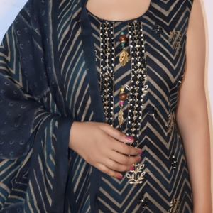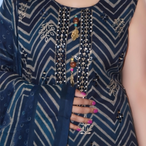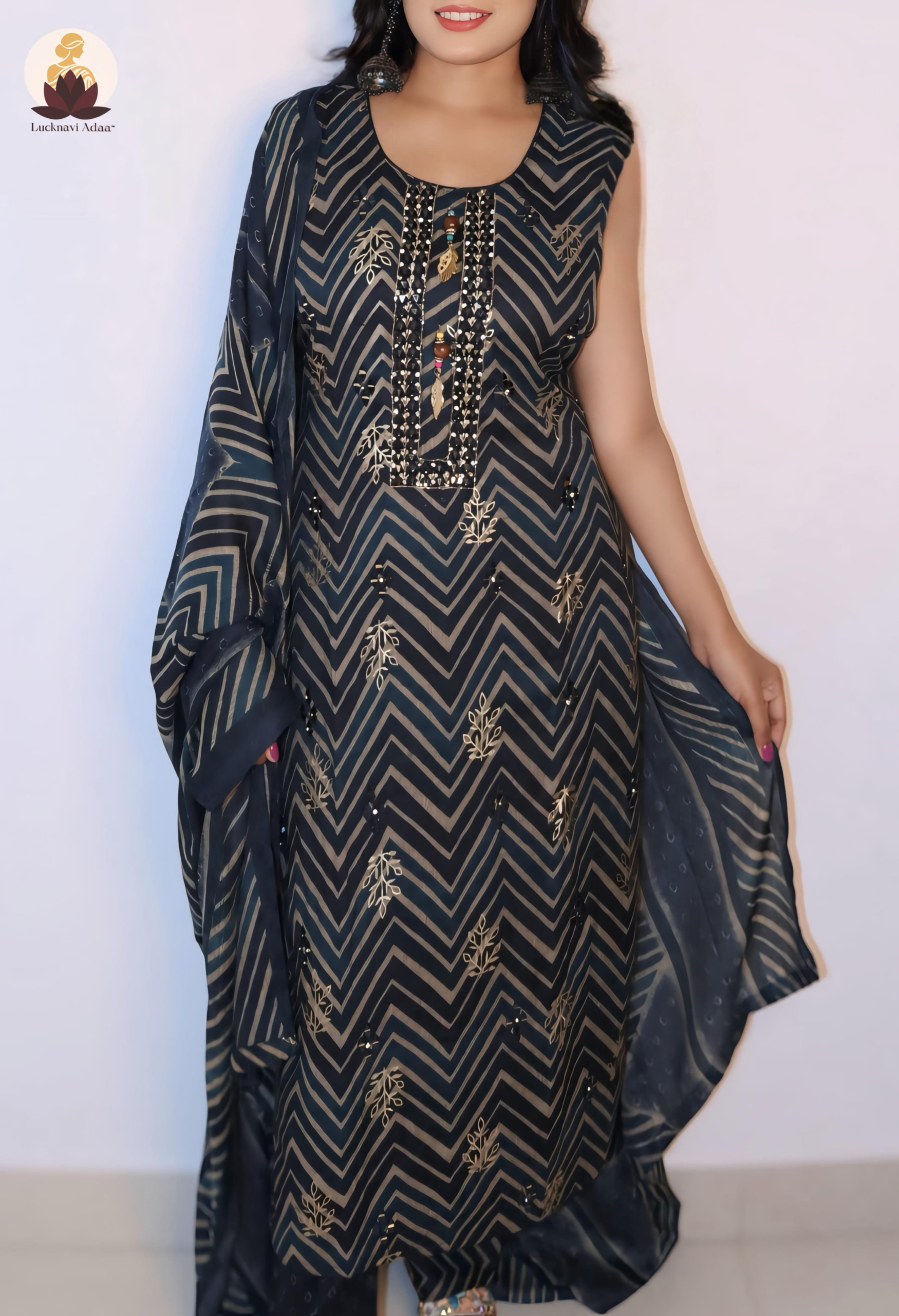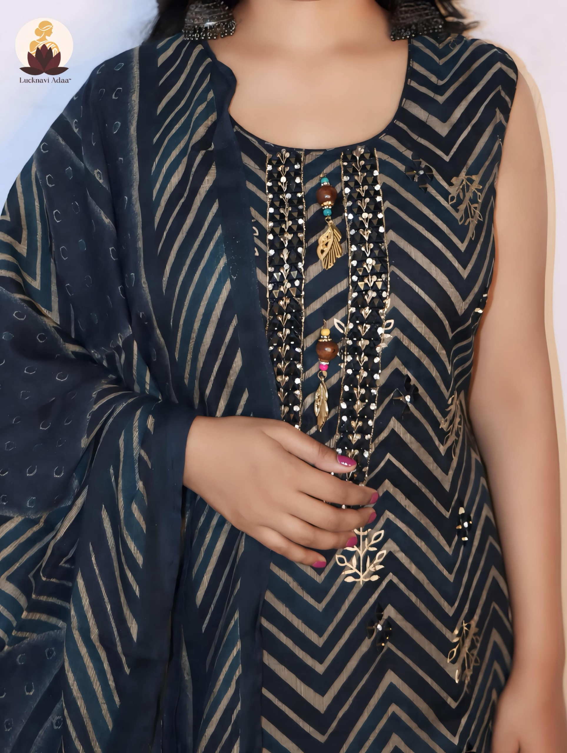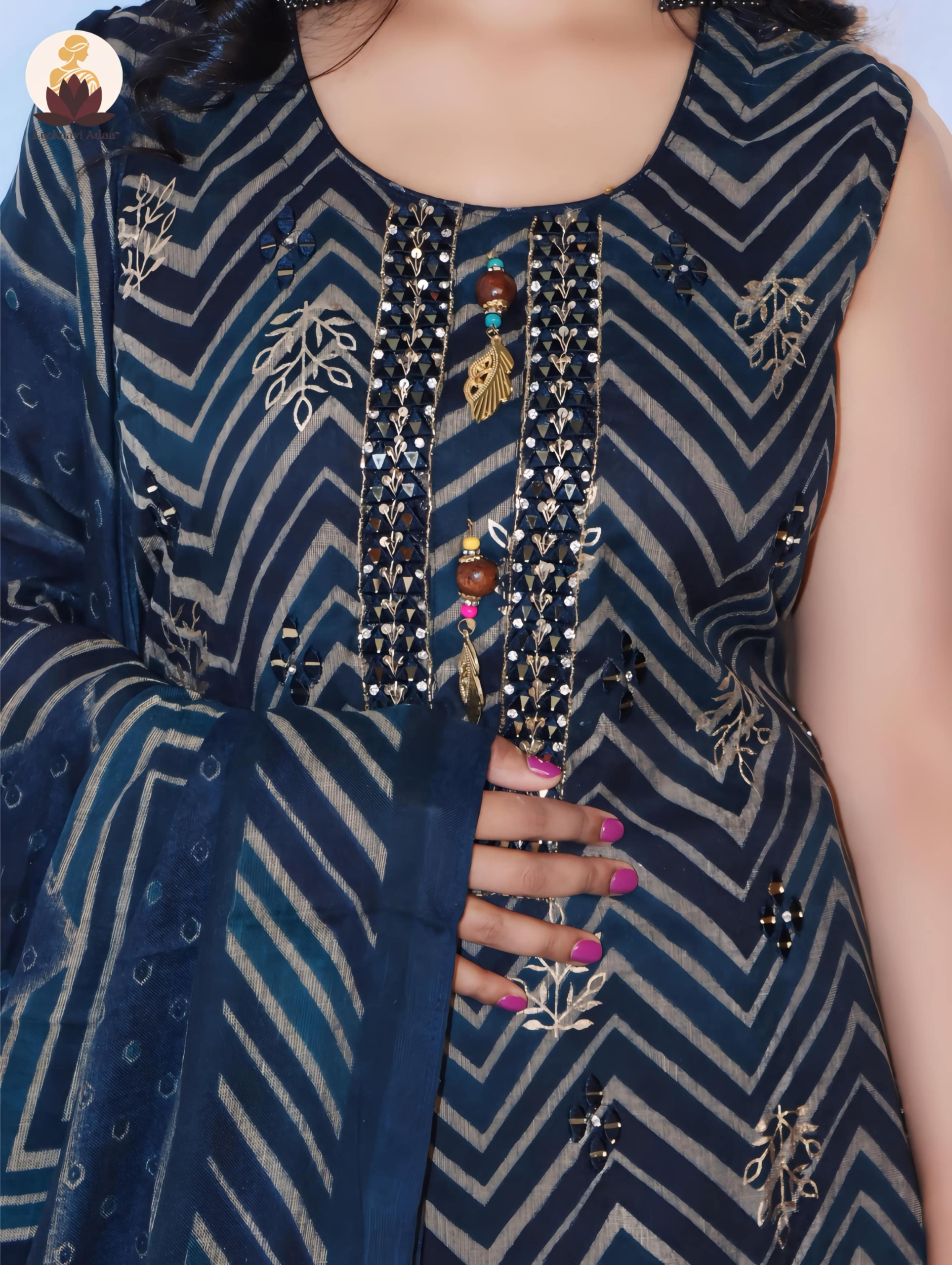 Redefine festive fashion with Lucknavi Adaa’s Navy Blue Chevron Print Suit Set. Designed in a rich navy base with striking golden chevron and floral motifs, this sleeveless kurta brings a bold vibe. The neckline is enhanced with mirror work and tassel details, adding just the right amount of sparkle.