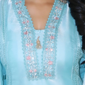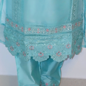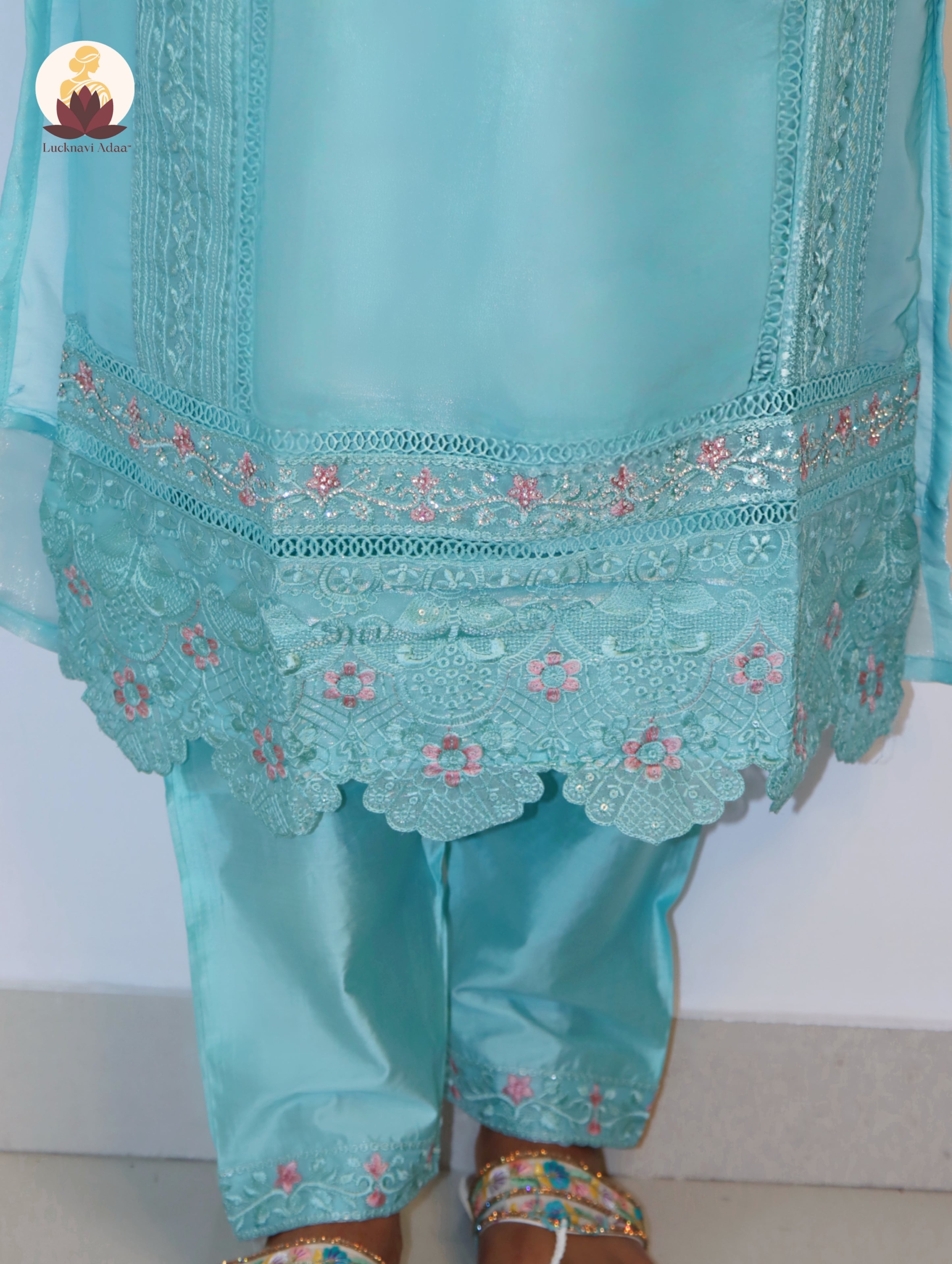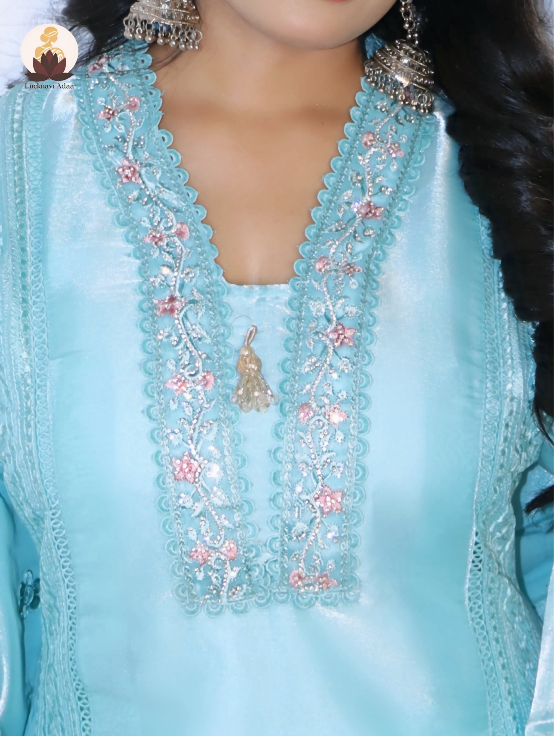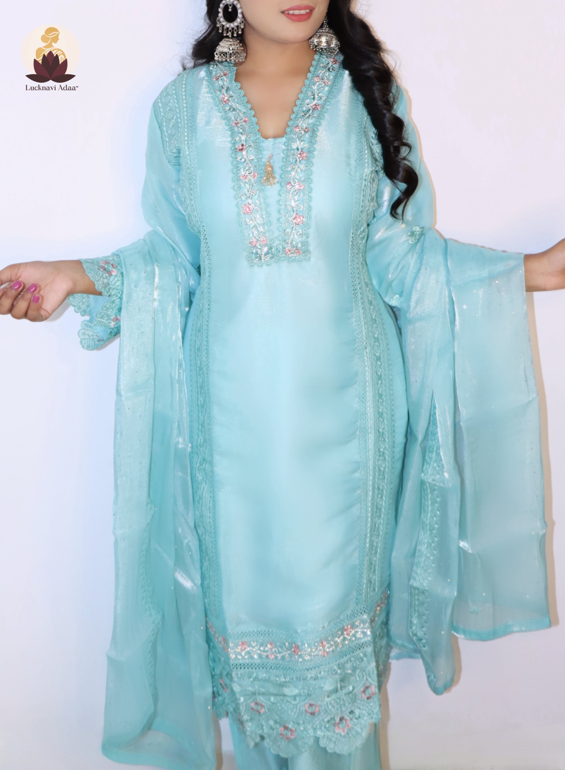 Turn heads with Lucknavi Adaa’s Aqua Blue Embroidered Suit Set, a dreamy pastel ensemble that blends sophistication with charm. Designed in a soothing aqua shade, the kurta is detailed with intricate embroidery, lace borders, and sequin accents for a refined yet festive touch.