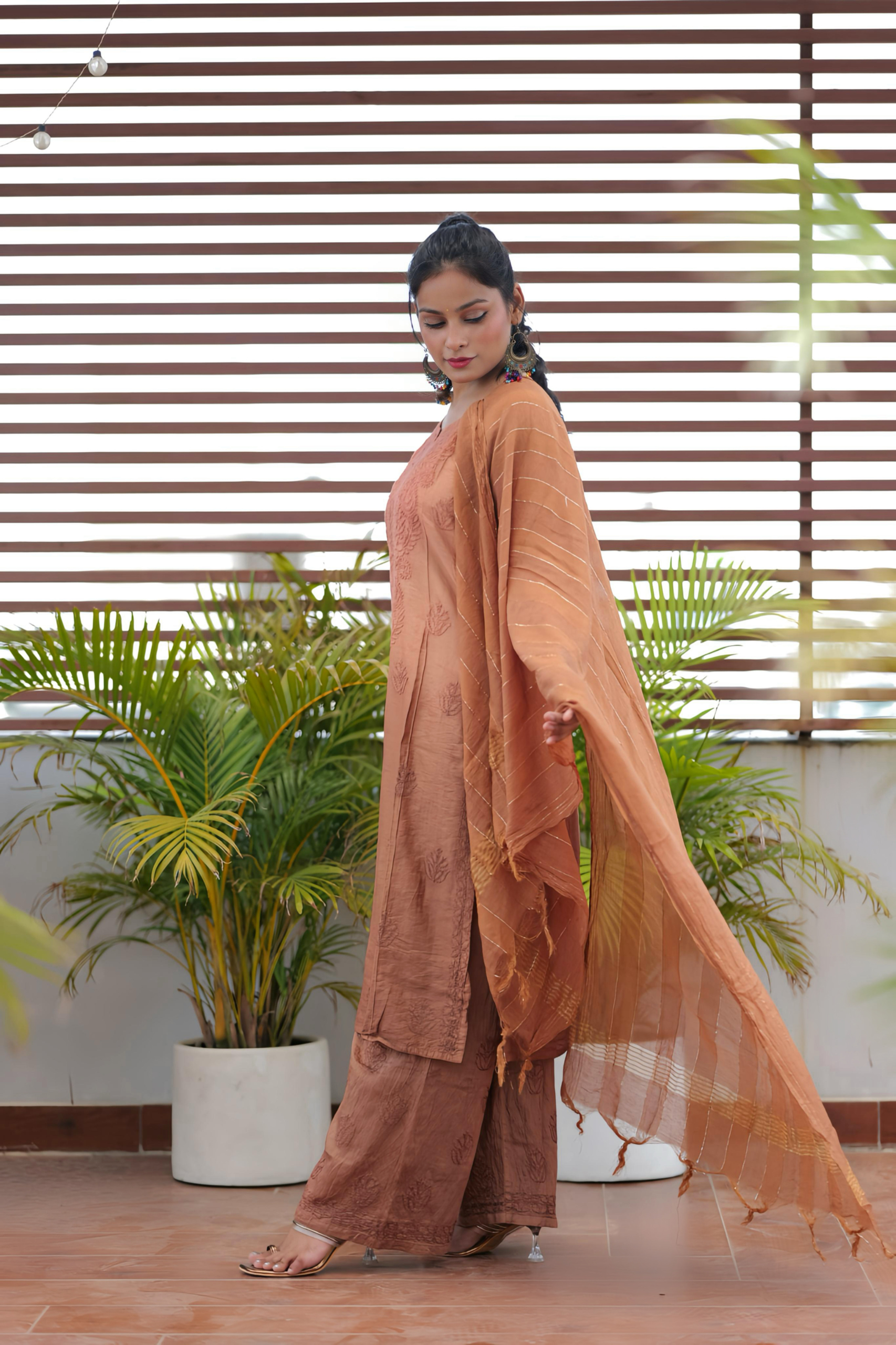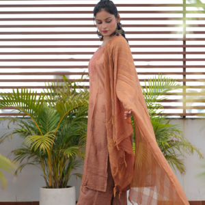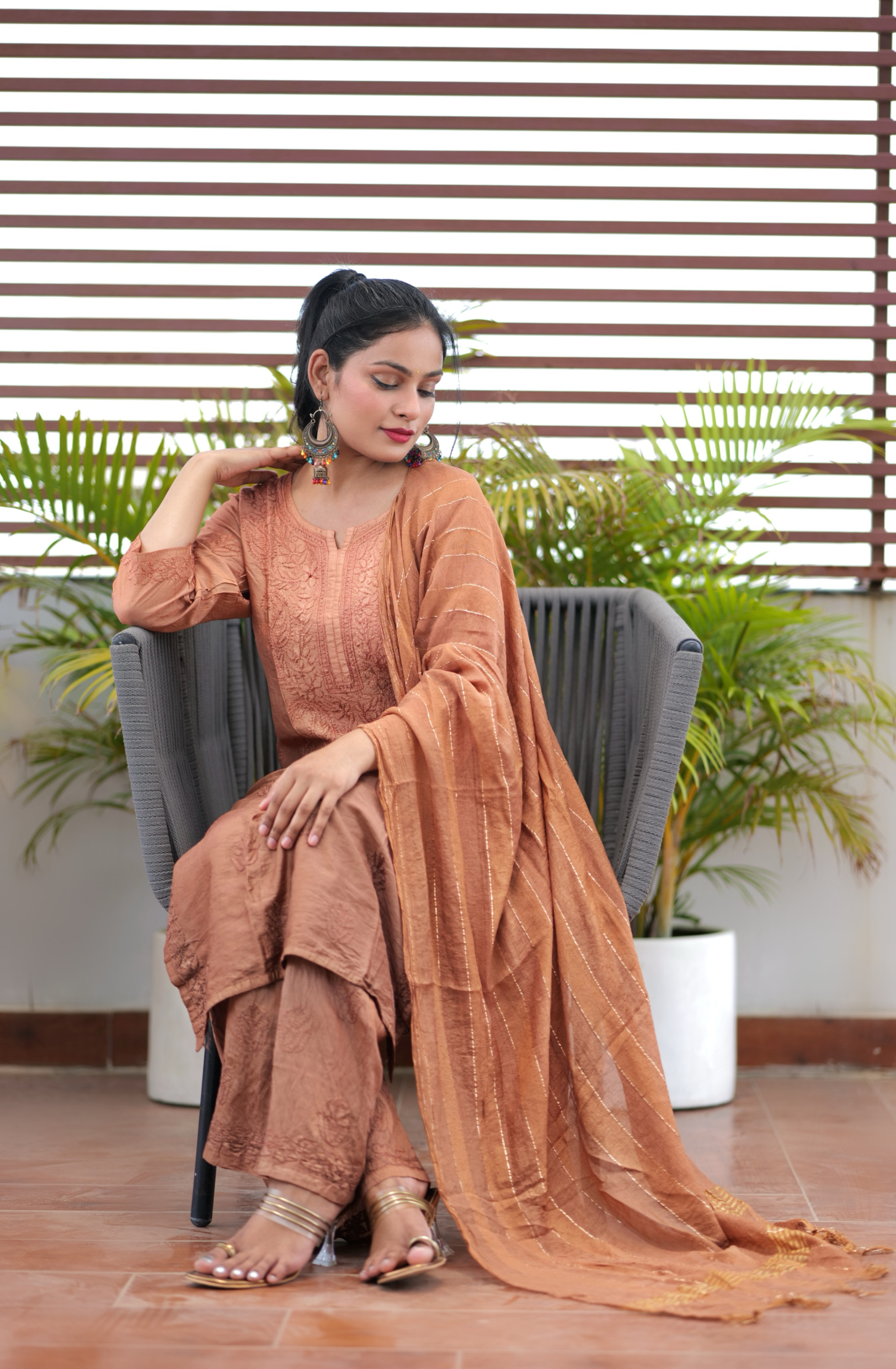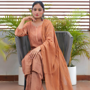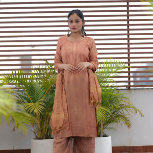 Make a graceful statement with this elegant aqua blue Chanderi kurti set from Lucknavi Adaa. Crafted from luxurious, lightweight Chanderi fabric, this three-piece set features a straight-cut kurti, flared palazzo pants, and a soft striped dupatta that flows effortlessly with every move. The subtle sheen of Chanderi, combined with intricate detailing, gives it a regal yet breezy appeal — perfect for festive mornings, brunch dates, or intimate celebrations. Whether you pair it with oxidized jhumkas or minimalist heels, this outfit promises poise and comfort in every step.