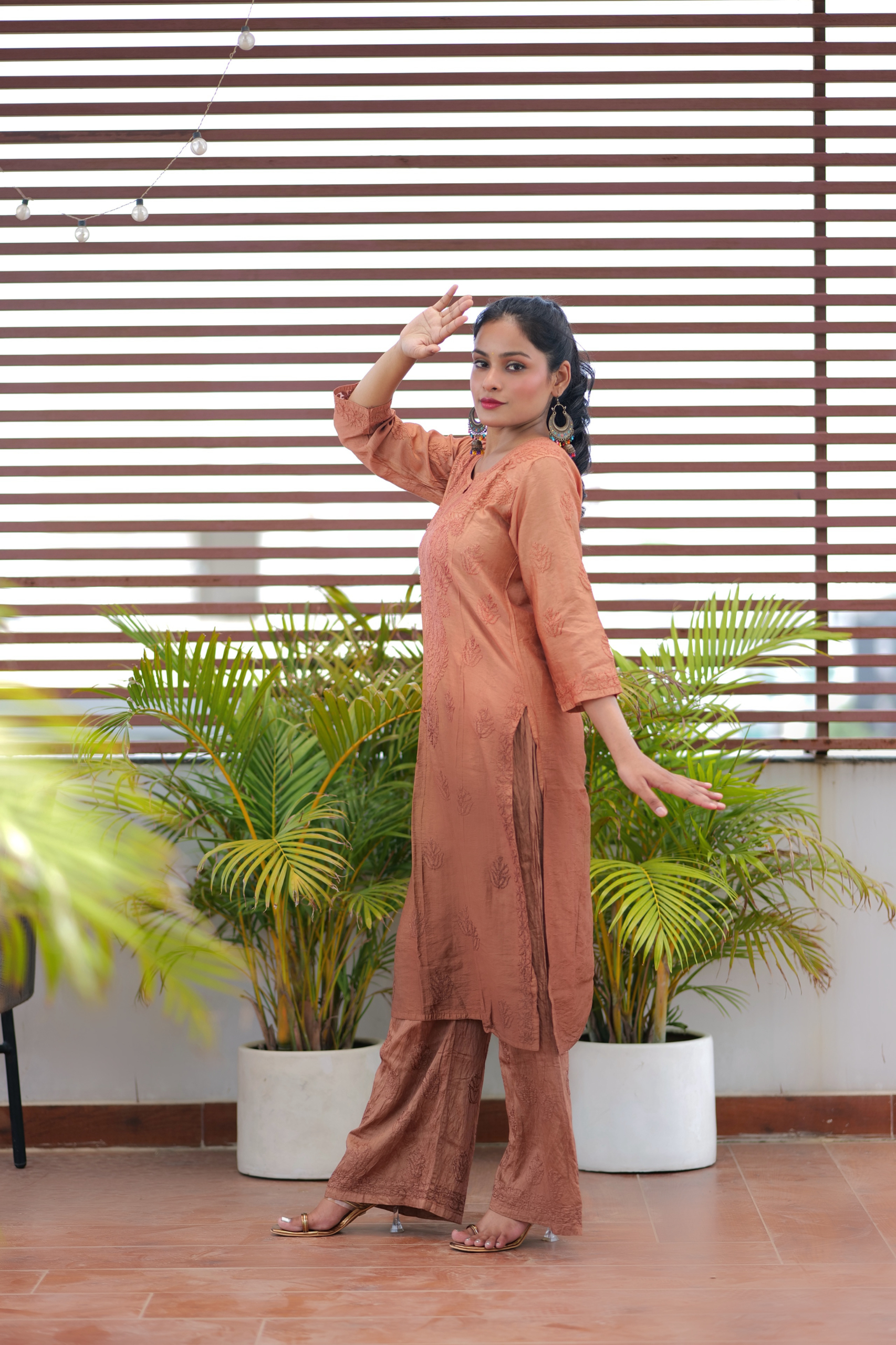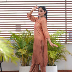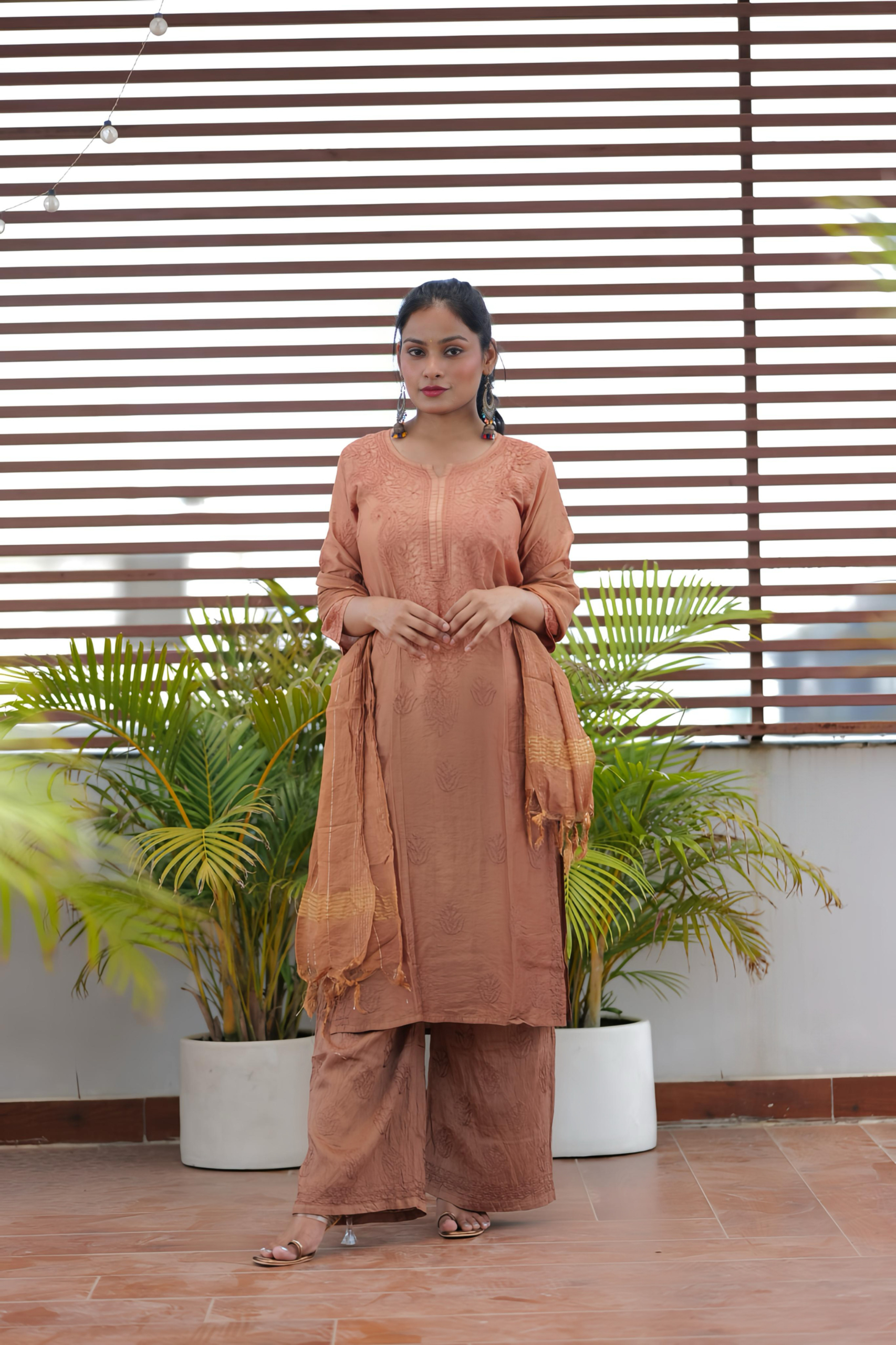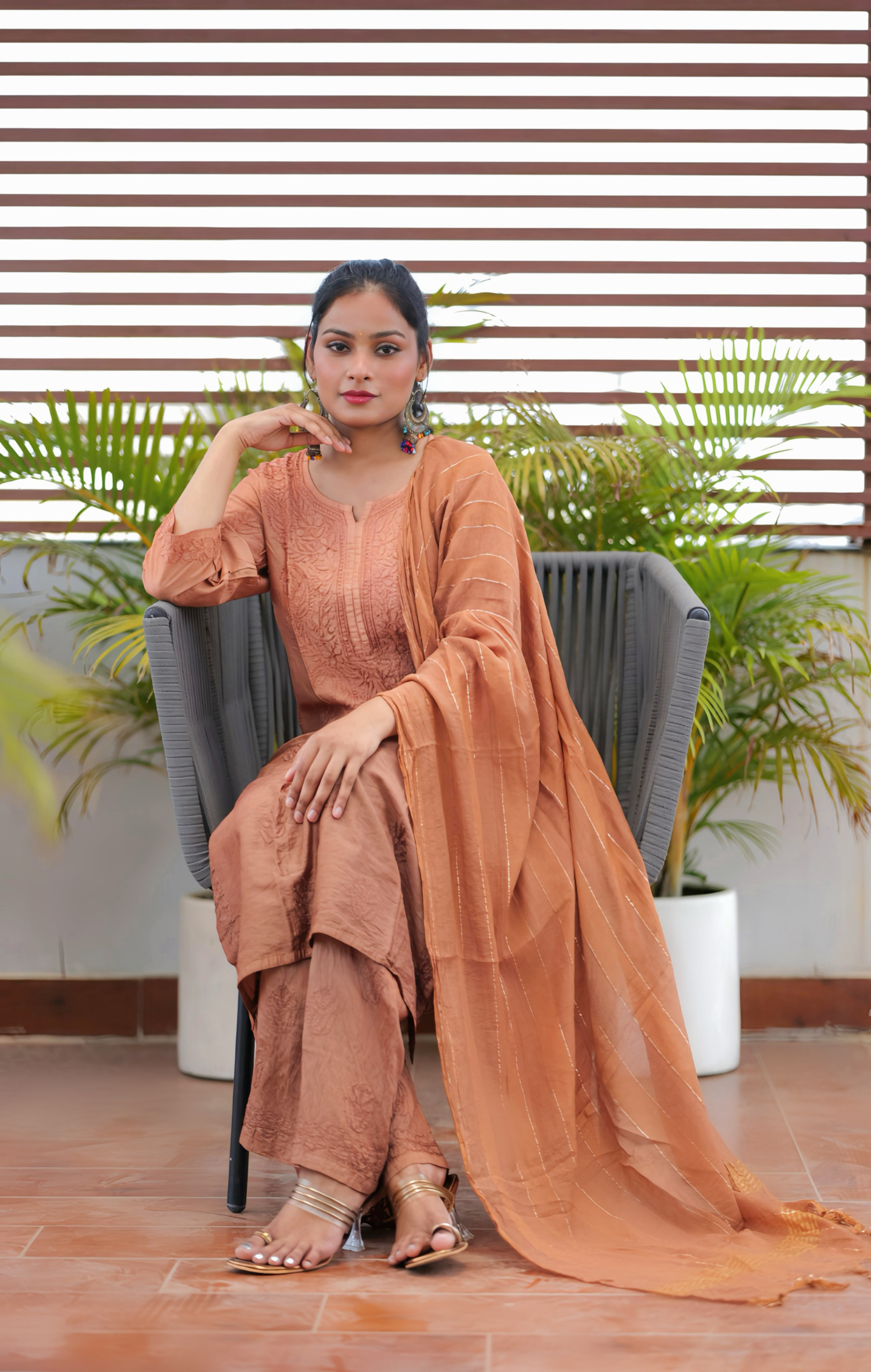 Make a graceful statement with this elegant aqua blue Chanderi kurti set from Lucknavi Adaa. Crafted from luxurious, lightweight Chanderi fabric, this three-piece set features a straight-cut kurti, flared palazzo pants, and a soft striped dupatta that flows effortlessly with every move. The subtle sheen of Chanderi, combined with intricate detailing, gives it a regal yet breezy appeal — perfect for festive mornings, brunch dates, or intimate celebrations. Whether you pair it with oxidized jhumkas or minimalist heels, this outfit promises poise and comfort in every step.