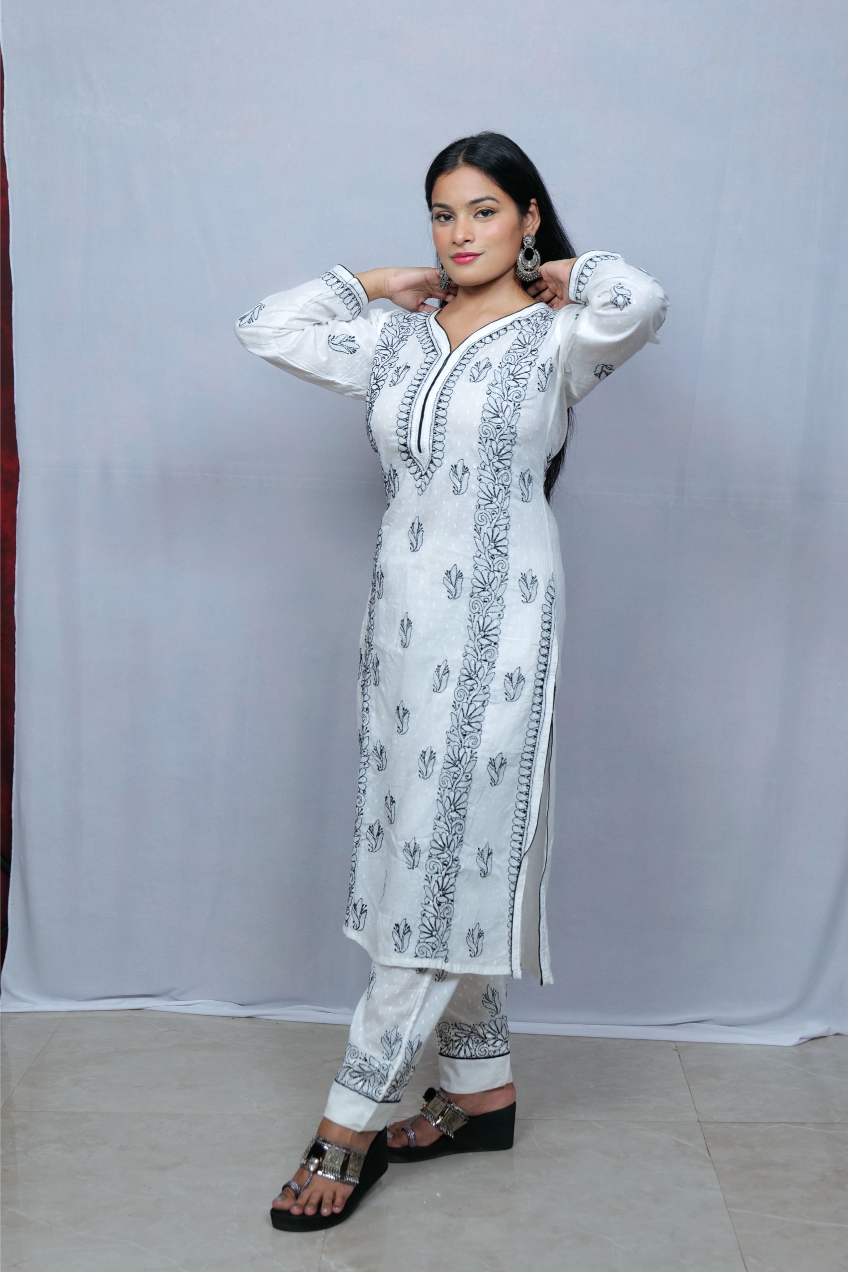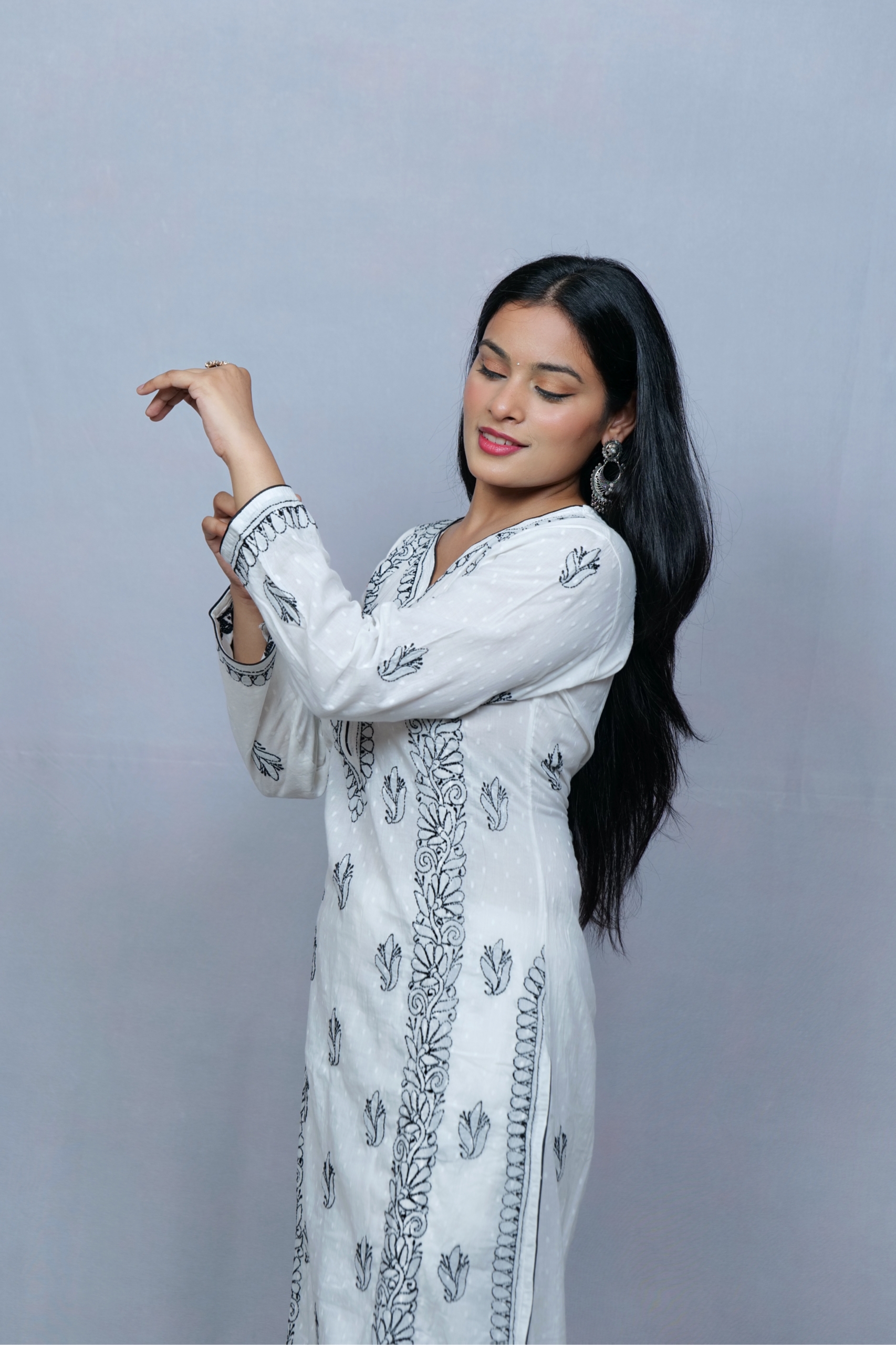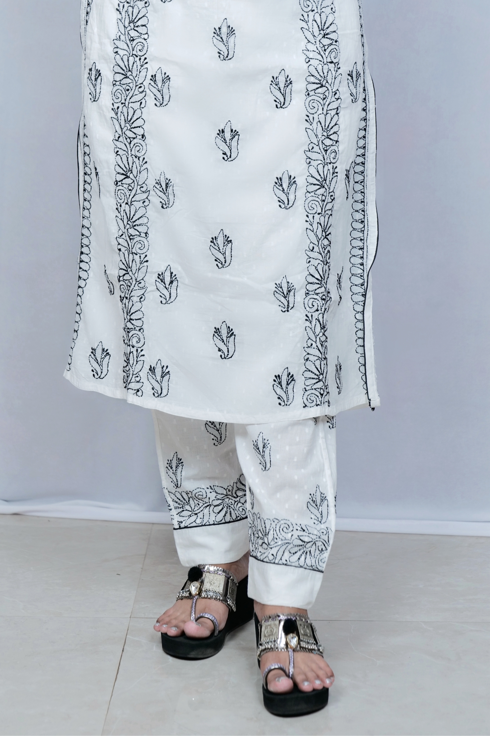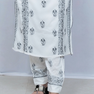 Step into timeless elegance with this stunning white Cotton suit with Bhakiya work from Lucknavi Adaa — a perfect blend of tradition and grace. This handcrafted ensemble features intricate black thread embroidery that runs delicately along the neckline, sleeves, and borders, giving it a refined and classic appeal.