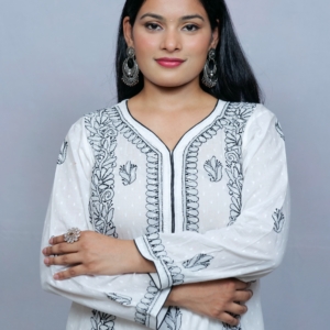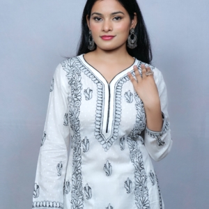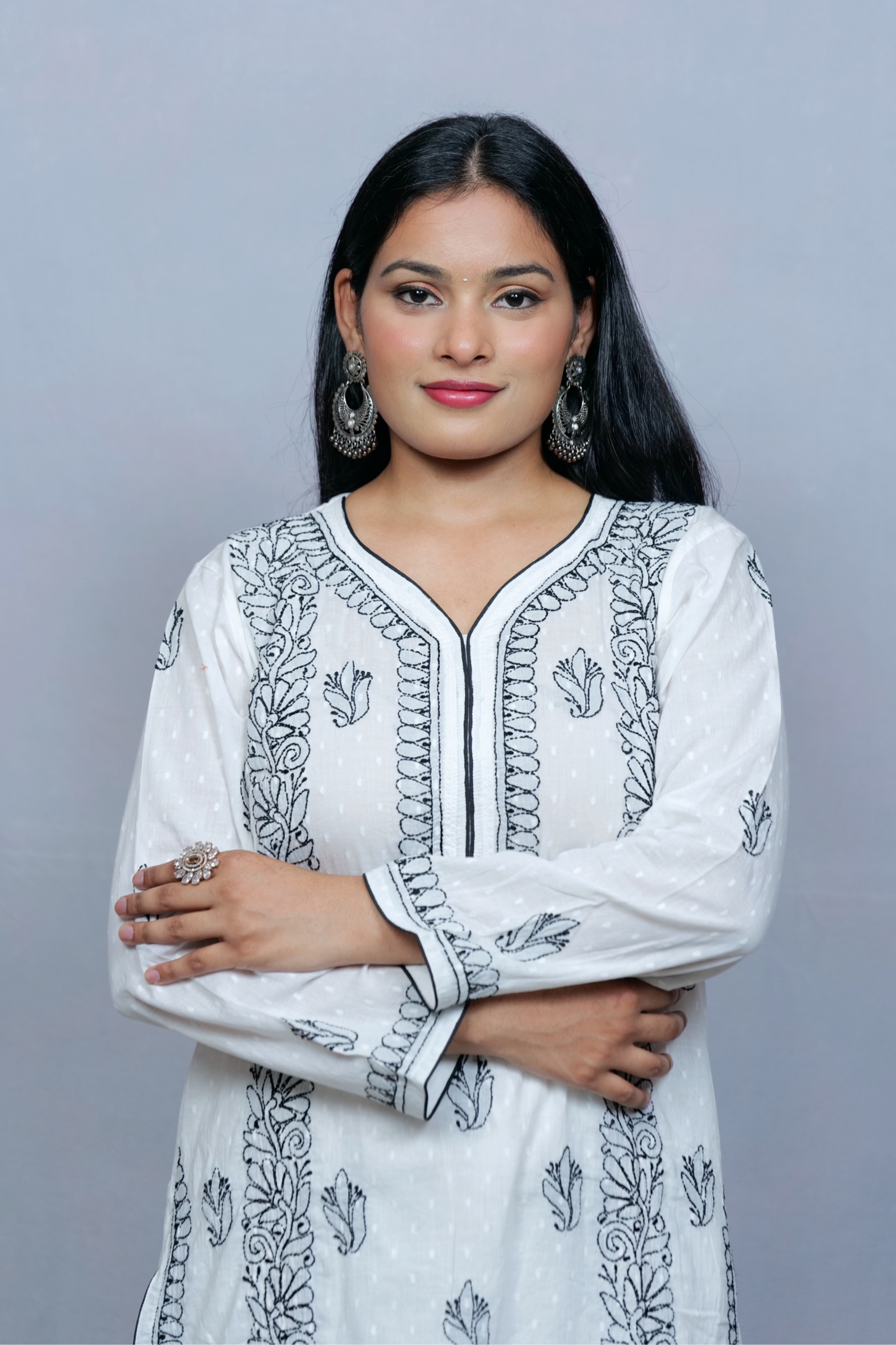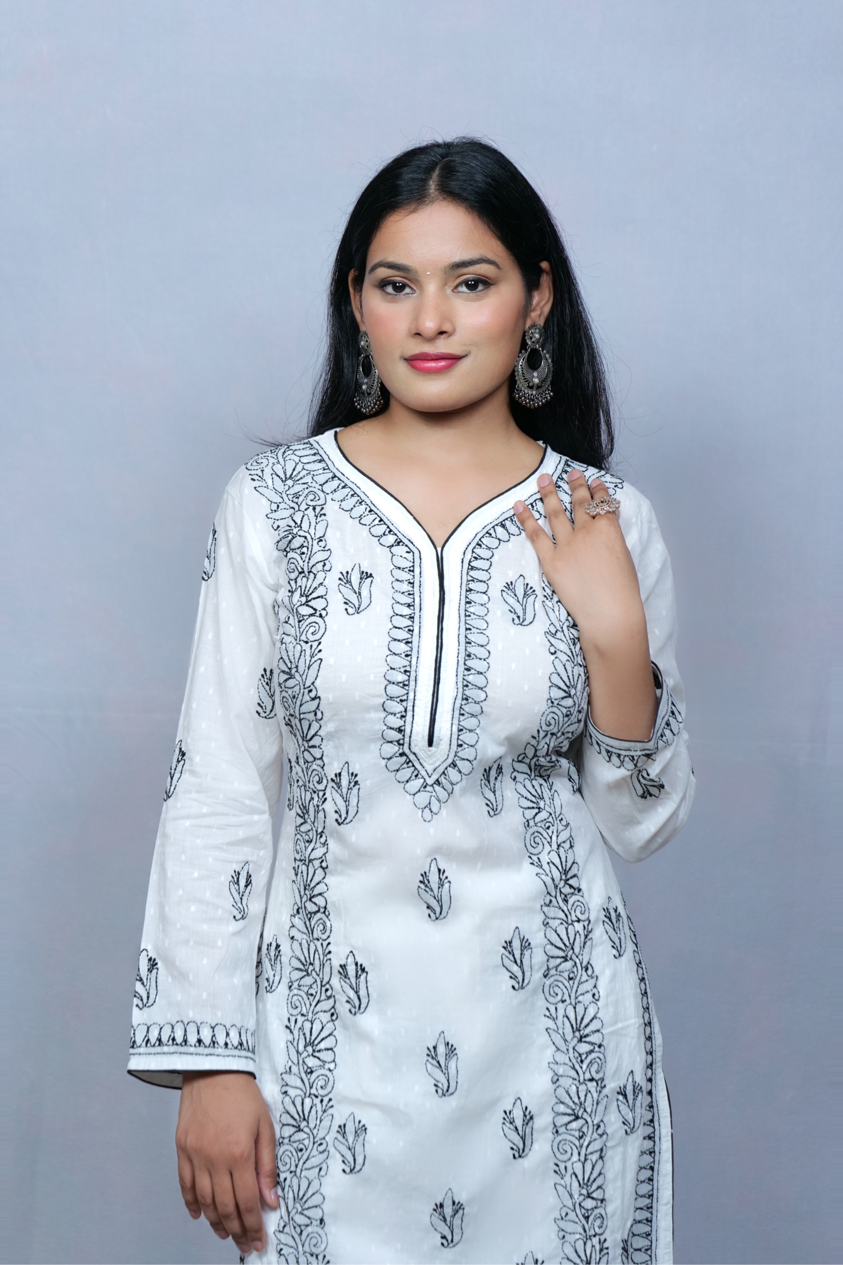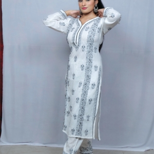 Step into timeless elegance with this stunning white Cotton suit with Bhakiya work from Lucknavi Adaa — a perfect blend of tradition and grace. This handcrafted ensemble features intricate black thread embroidery that runs delicately along the neckline, sleeves, and borders, giving it a refined and classic appeal.