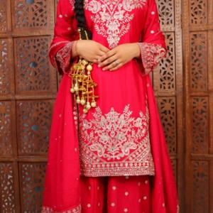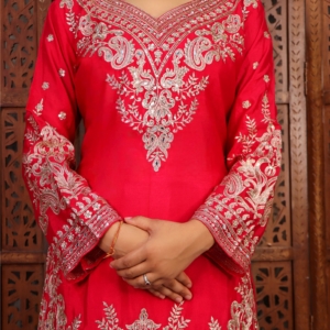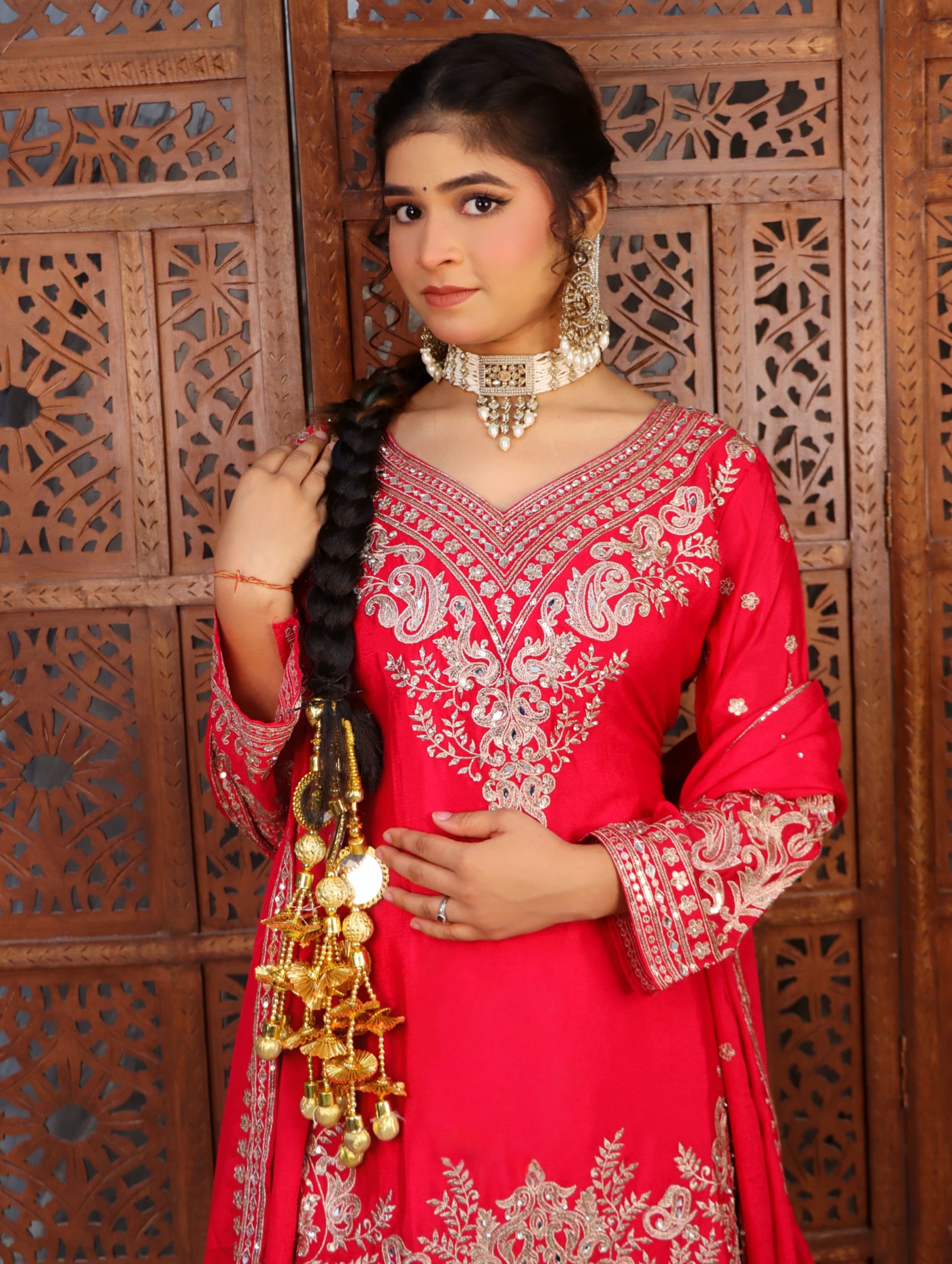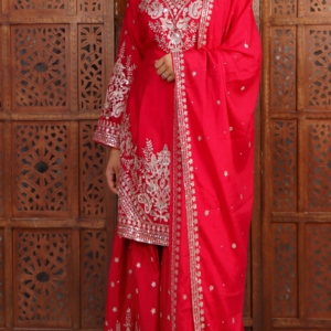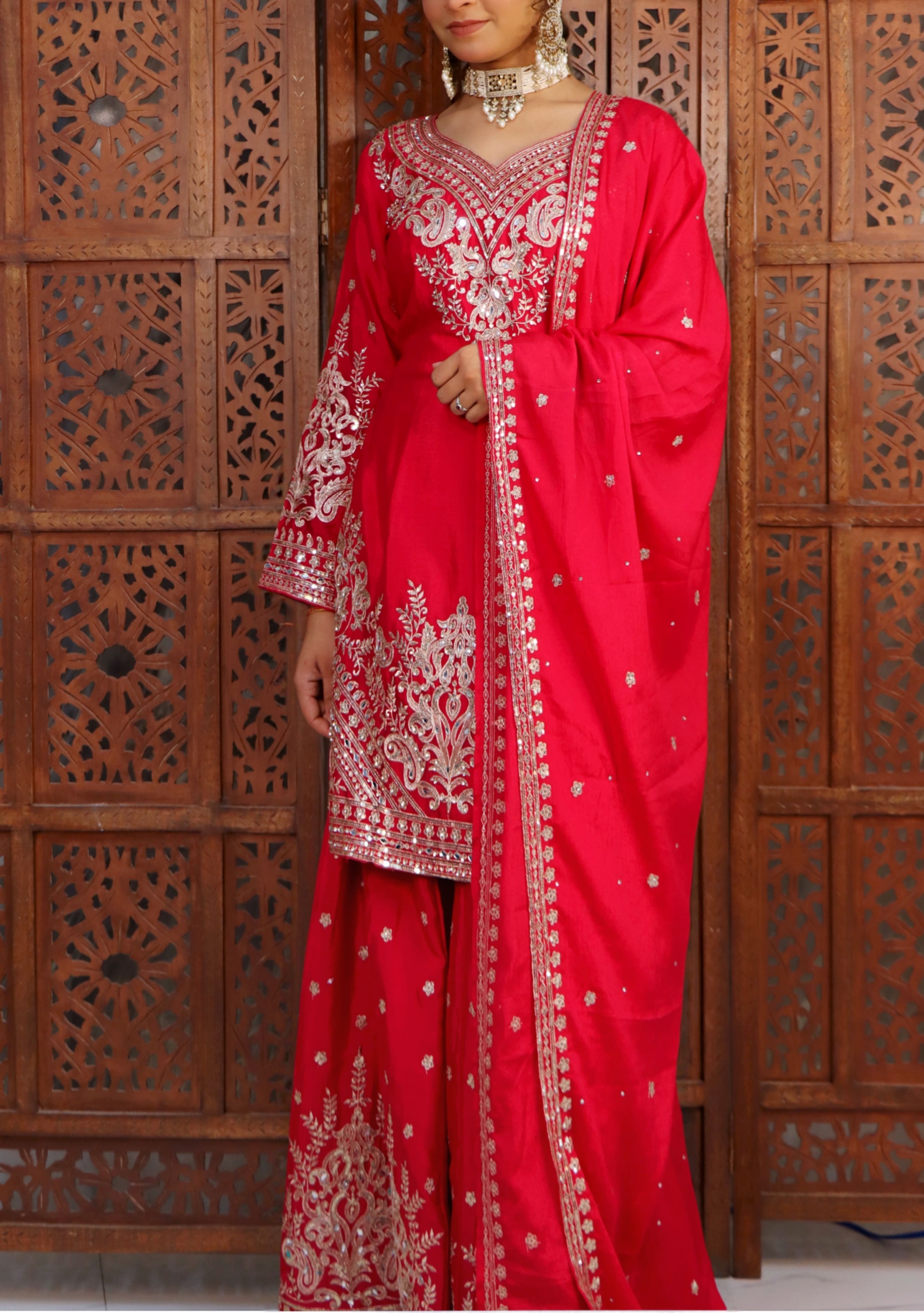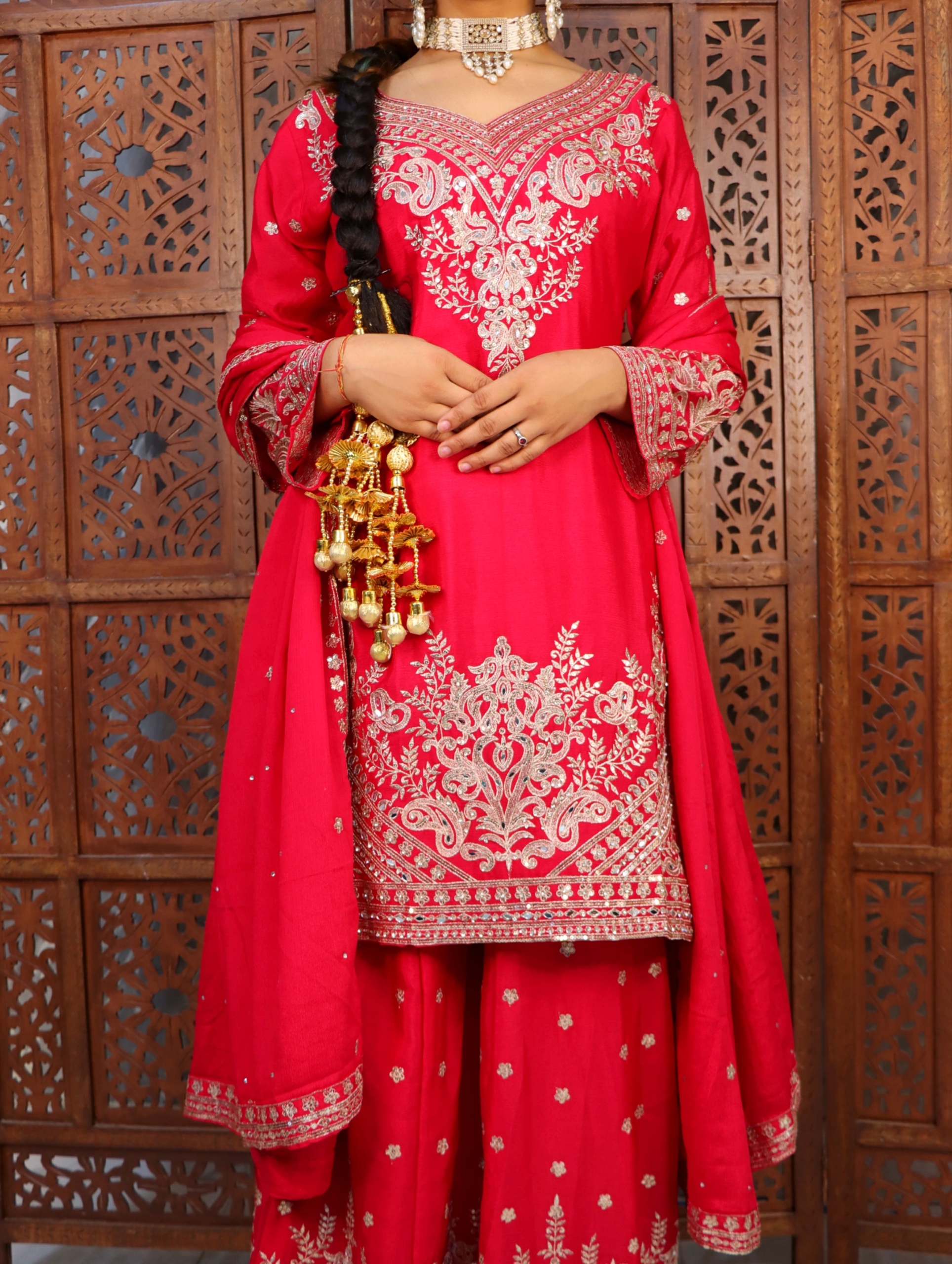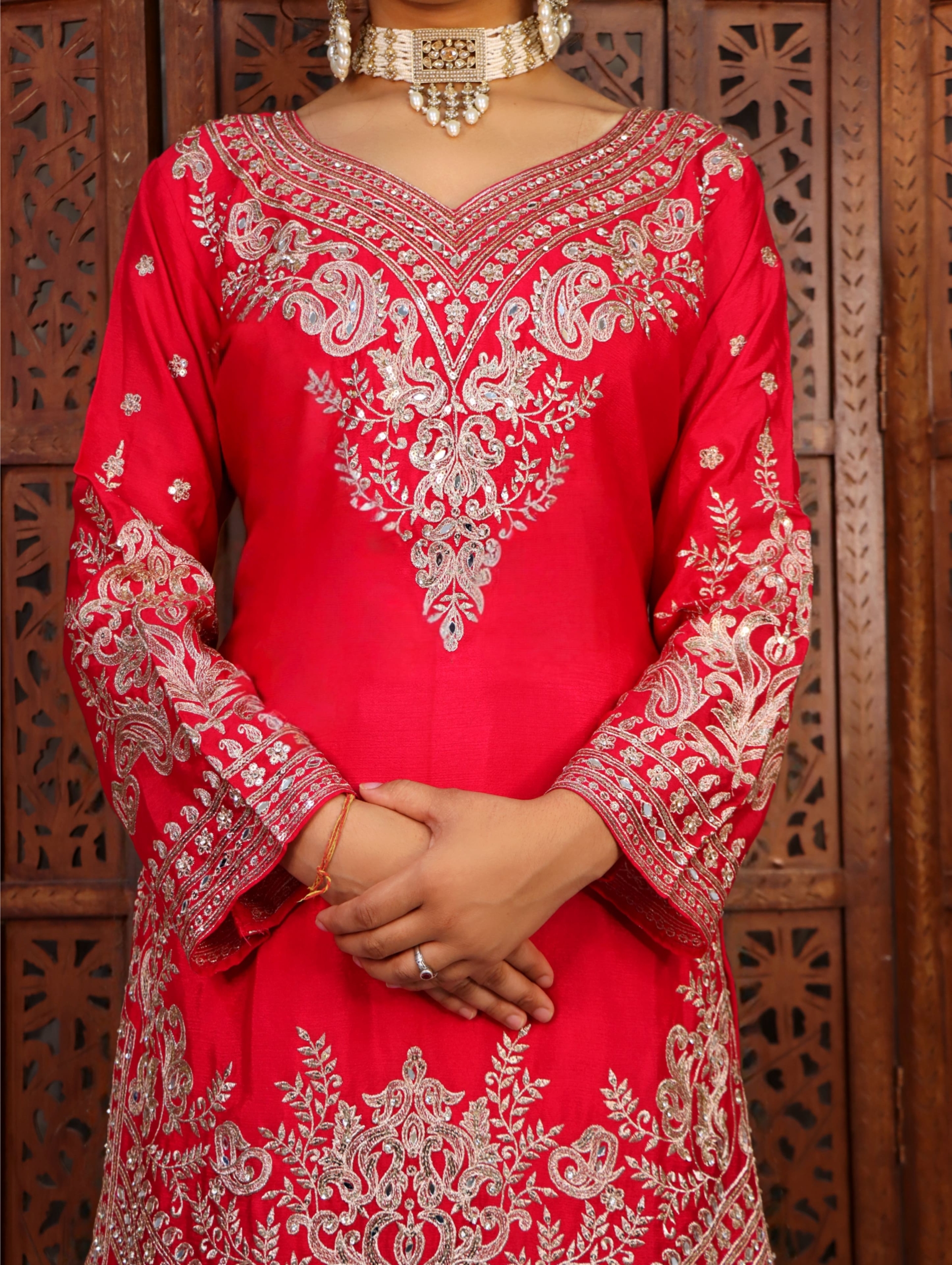 Turn heads with this stunning red embroidered suit set, Crafted in premium fabric, this three-piece set features intricate white resham embroidery on the kurta, paired with matching palazzo bottoms and a beautifully adorned dupatta. Perfect for weddings, festive occasions, and special gatherings, this outfit embodies elegance with a touch of royal charm. Pair it with statement jewelry to complete the look.