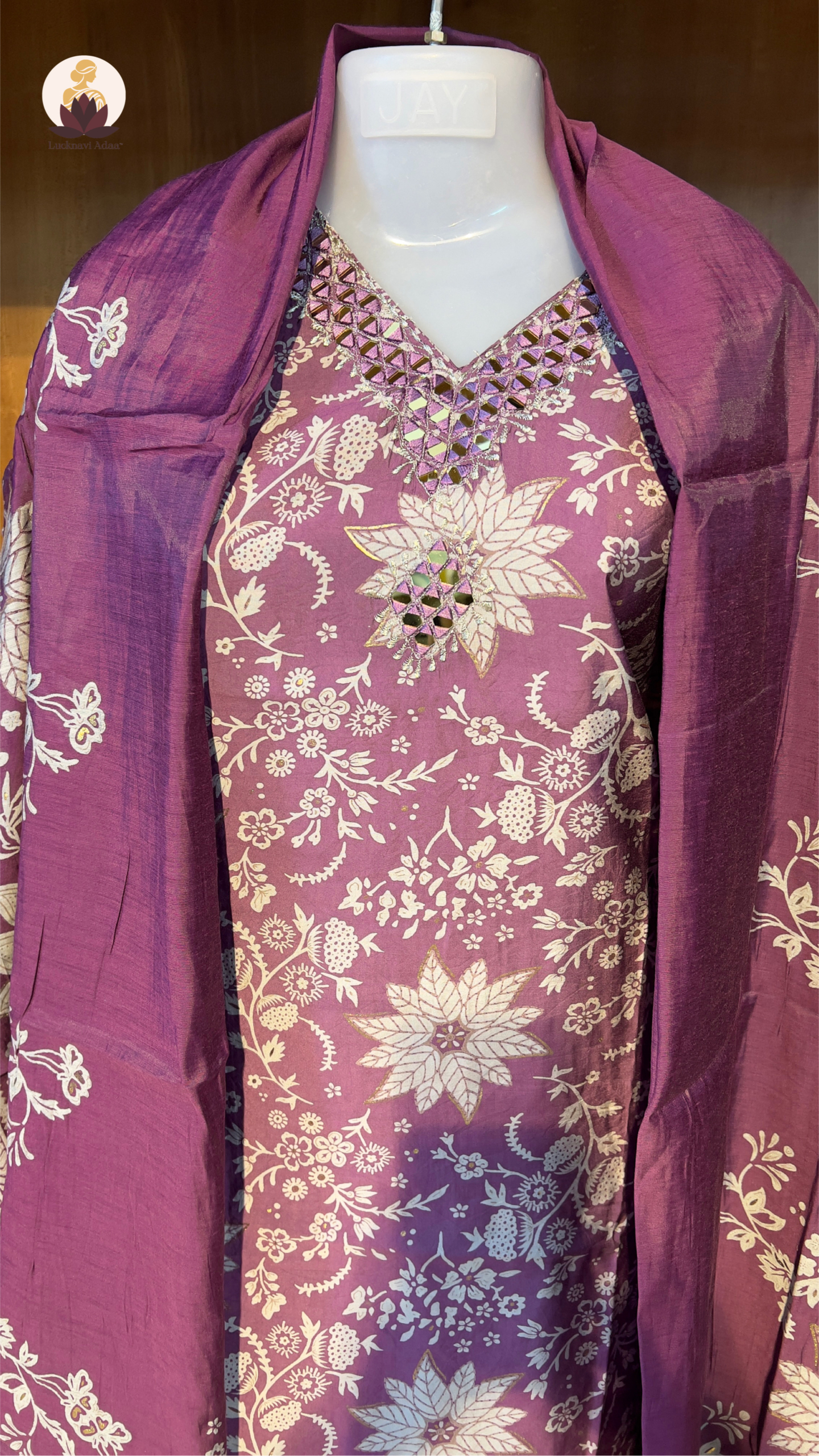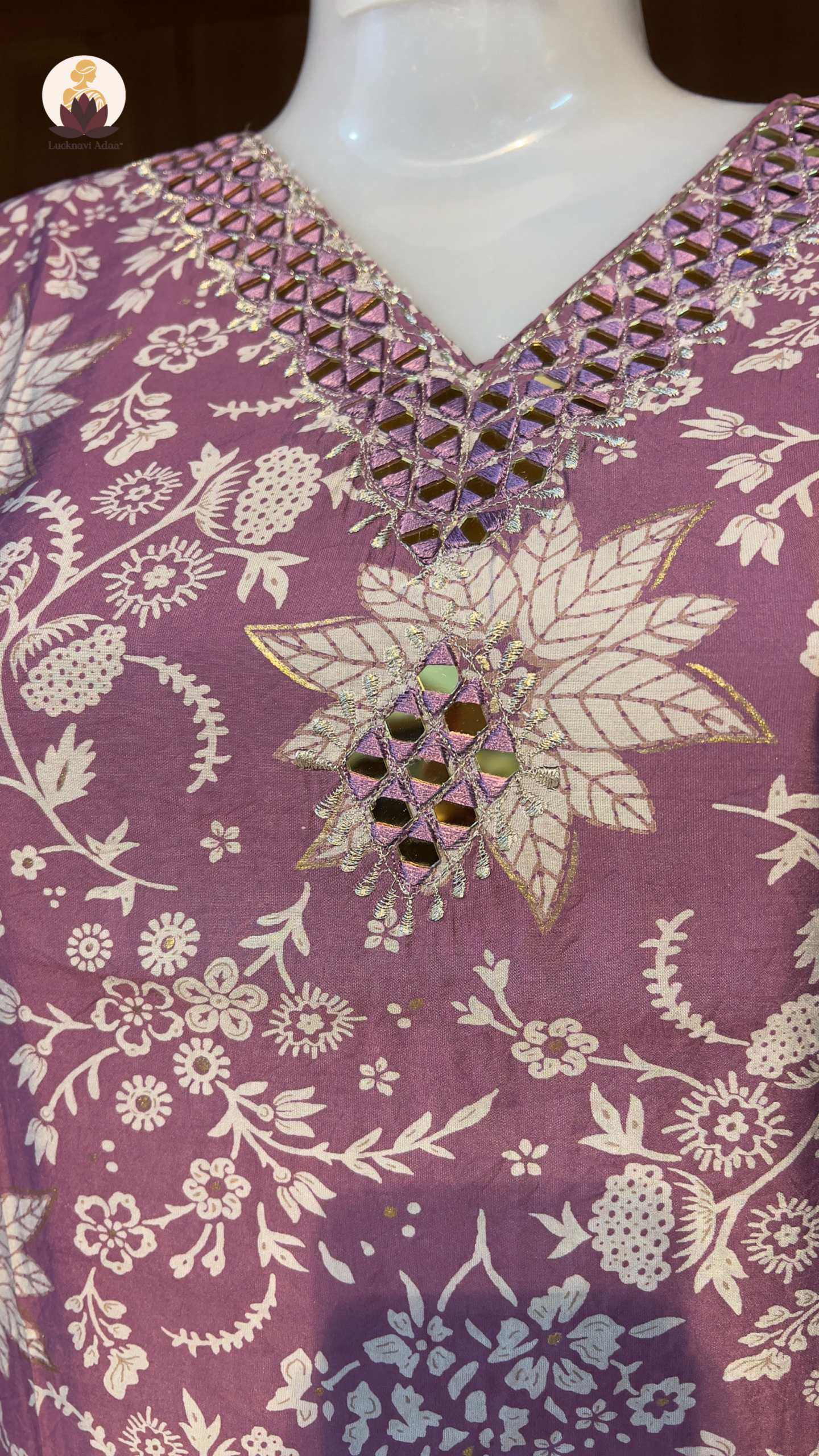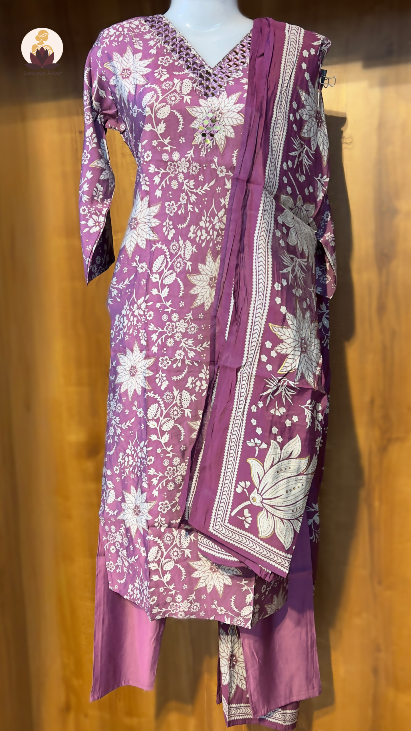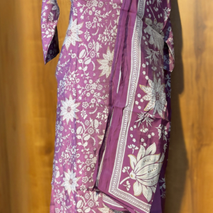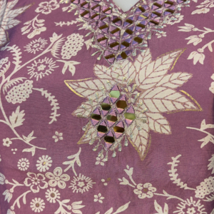 Make a graceful statement with this beautifully crafted mauve cotton suit set, adorned with intricate white floral prints and highlighted with exquisite mirror work around the neckline. Perfect for festive occasions, casual gatherings, or traditional functions, this suit combines elegance with comfort.