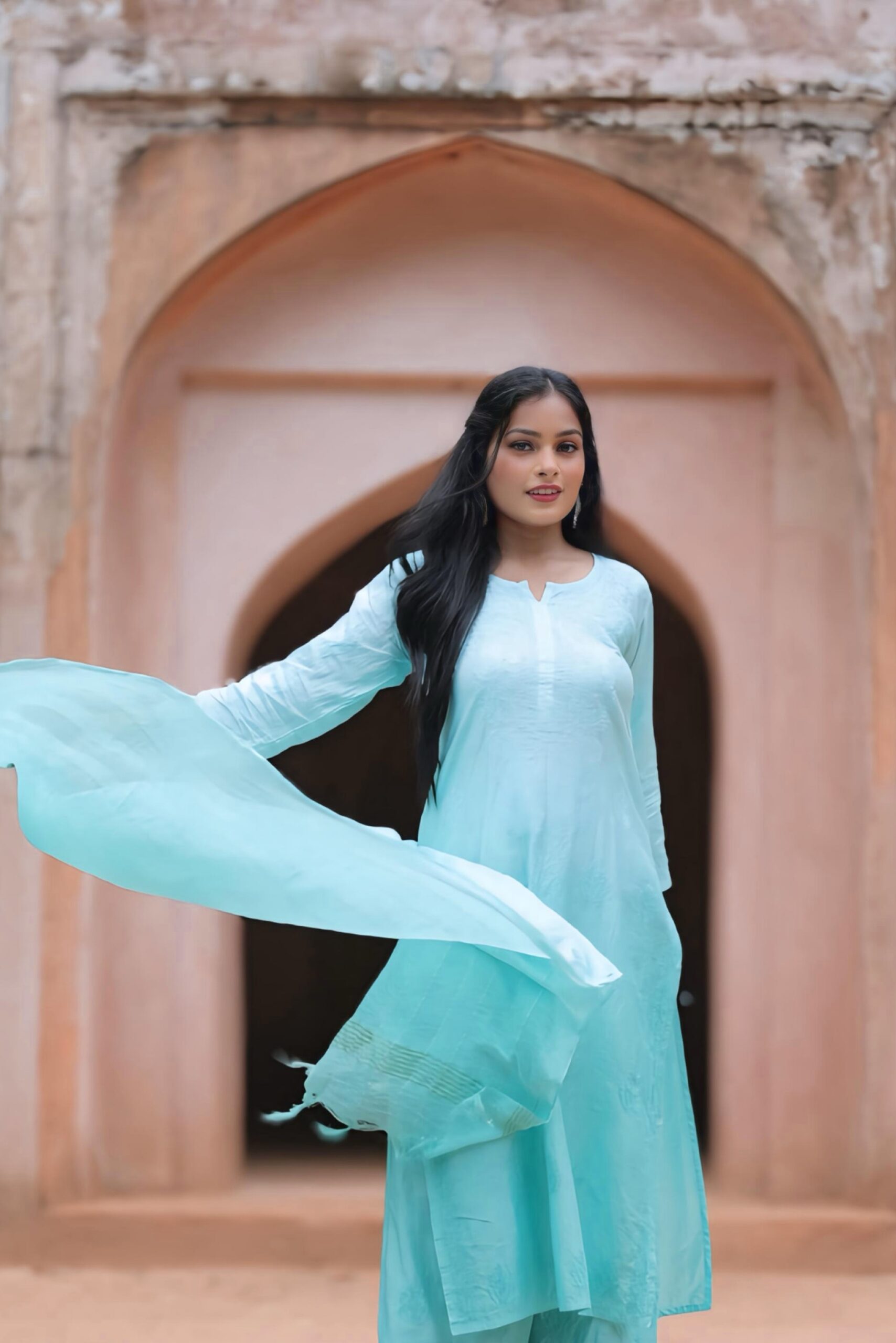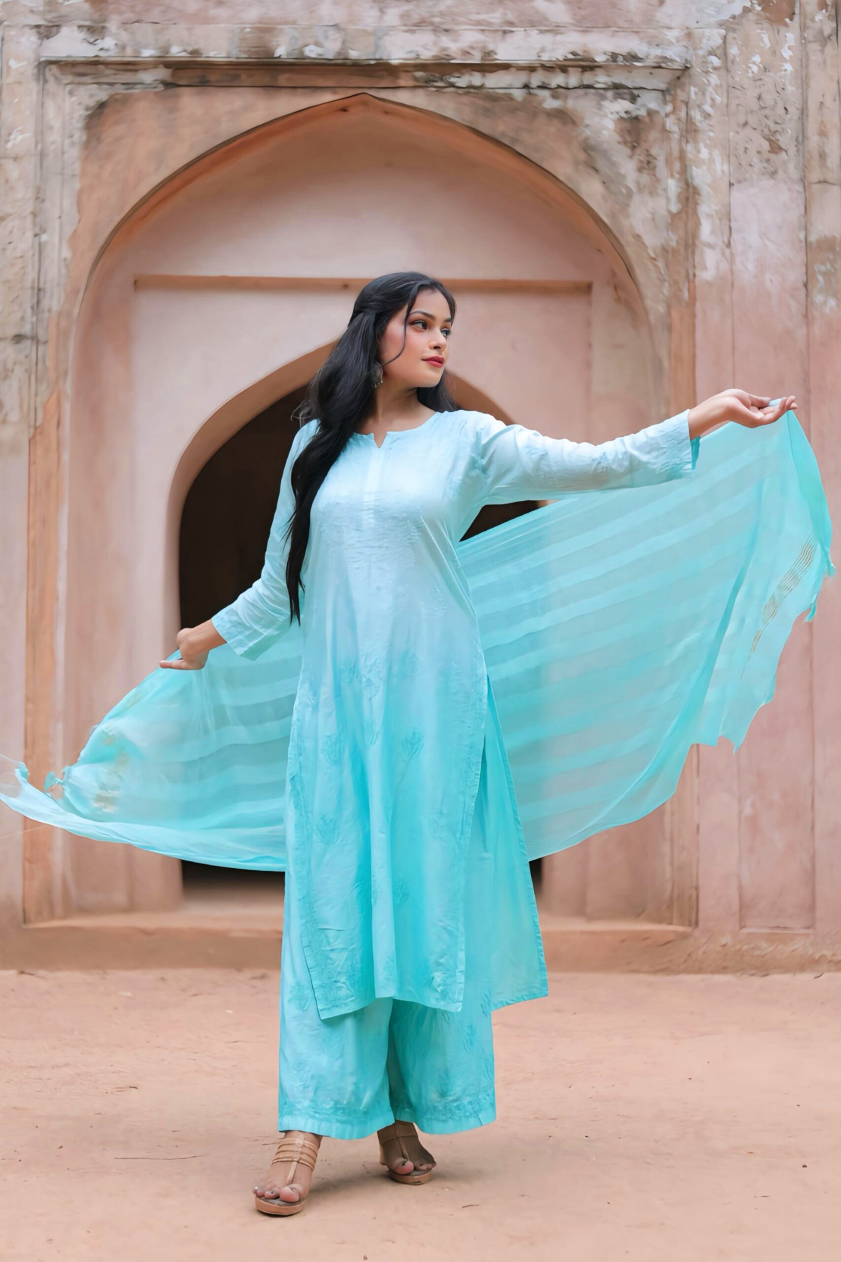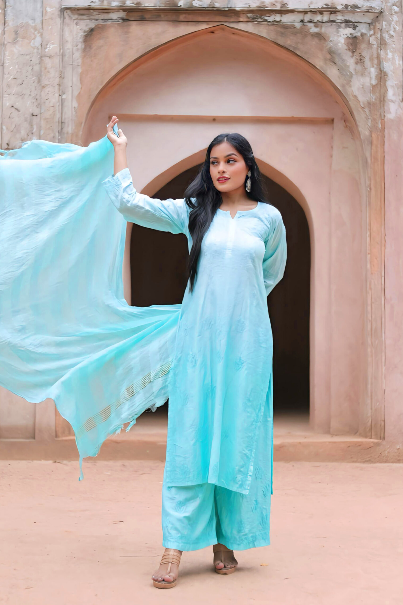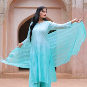 Make a graceful statement with this elegant aqua blue Chanderi kurti set from Lucknavi Adaa. Crafted from luxurious, lightweight Chanderi fabric, this three-piece set features a straight-cut kurti, flared palazzo pants, and a soft striped dupatta that flows effortlessly with every move. The subtle sheen of Chanderi, combined with intricate detailing, gives it a regal yet breezy appeal — perfect for festive mornings, brunch dates, or intimate celebrations. Whether you pair it with oxidized jhumkas or minimalist heels, this outfit promises poise and comfort in every step.