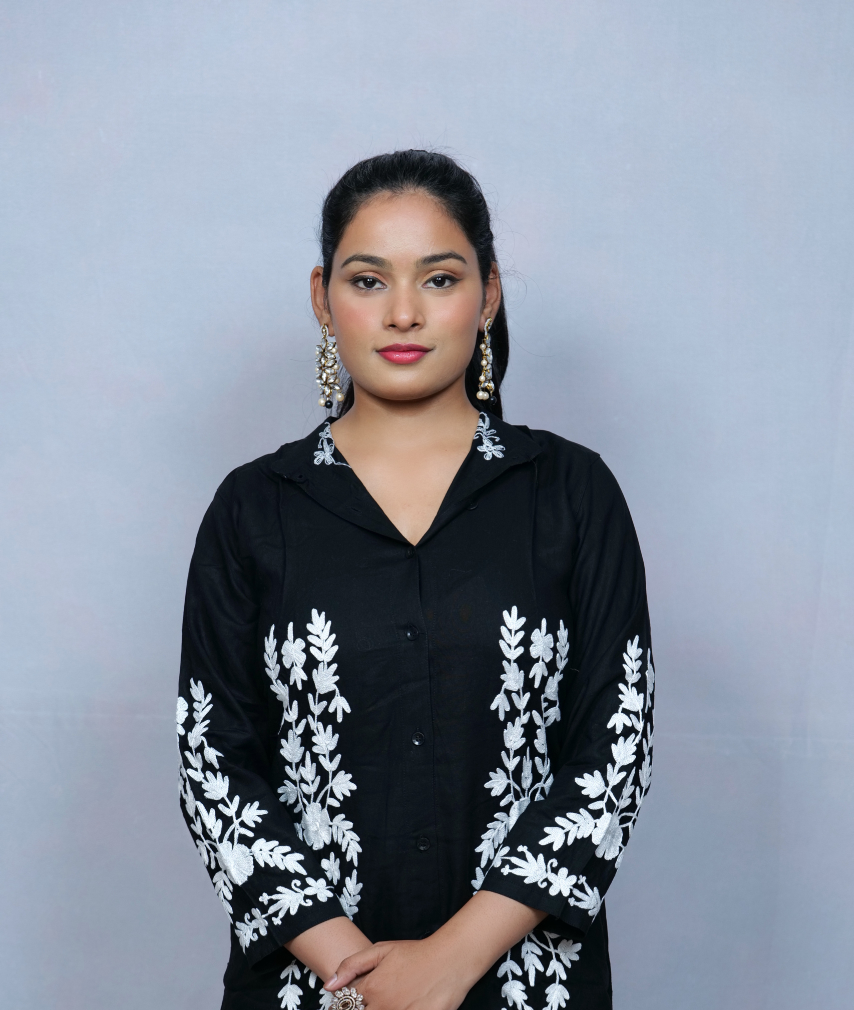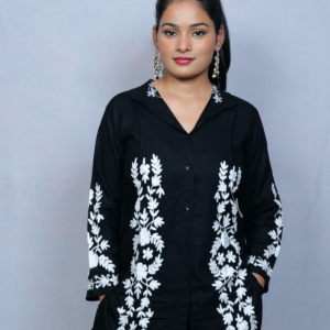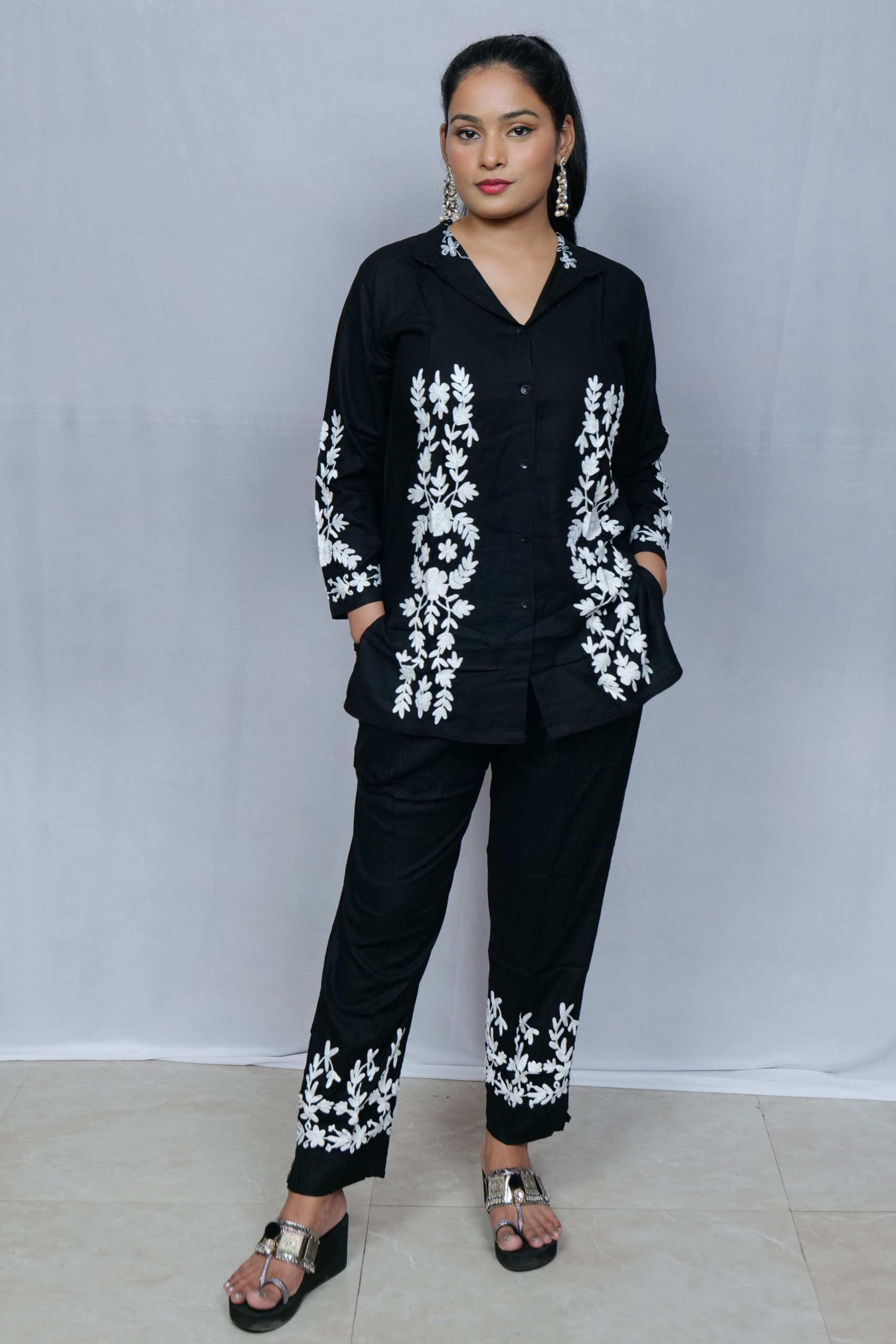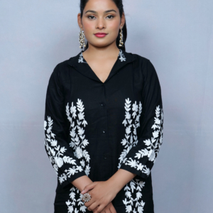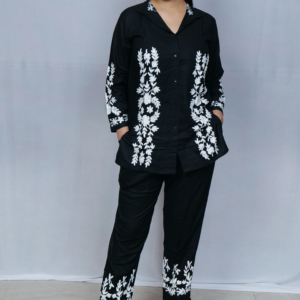 Redefine ethnic elegance with a modern twist in this black Chikankari coord set from Lucknavi Adaa. Featuring a collared shirt-style top with front buttons and matching straight pants, the outfit is elevated with exquisite white thread embroidery. Perfect for festive gatherings, office parties, or casual brunches—this set brings together comfort, confidence, and contemporary ethnic charm.