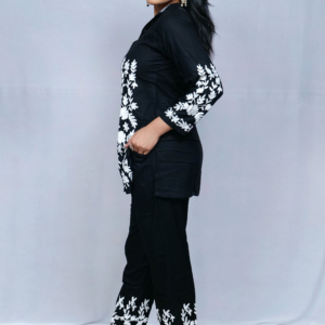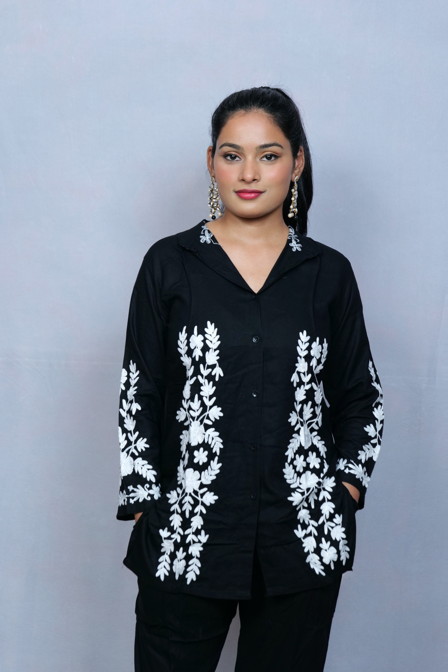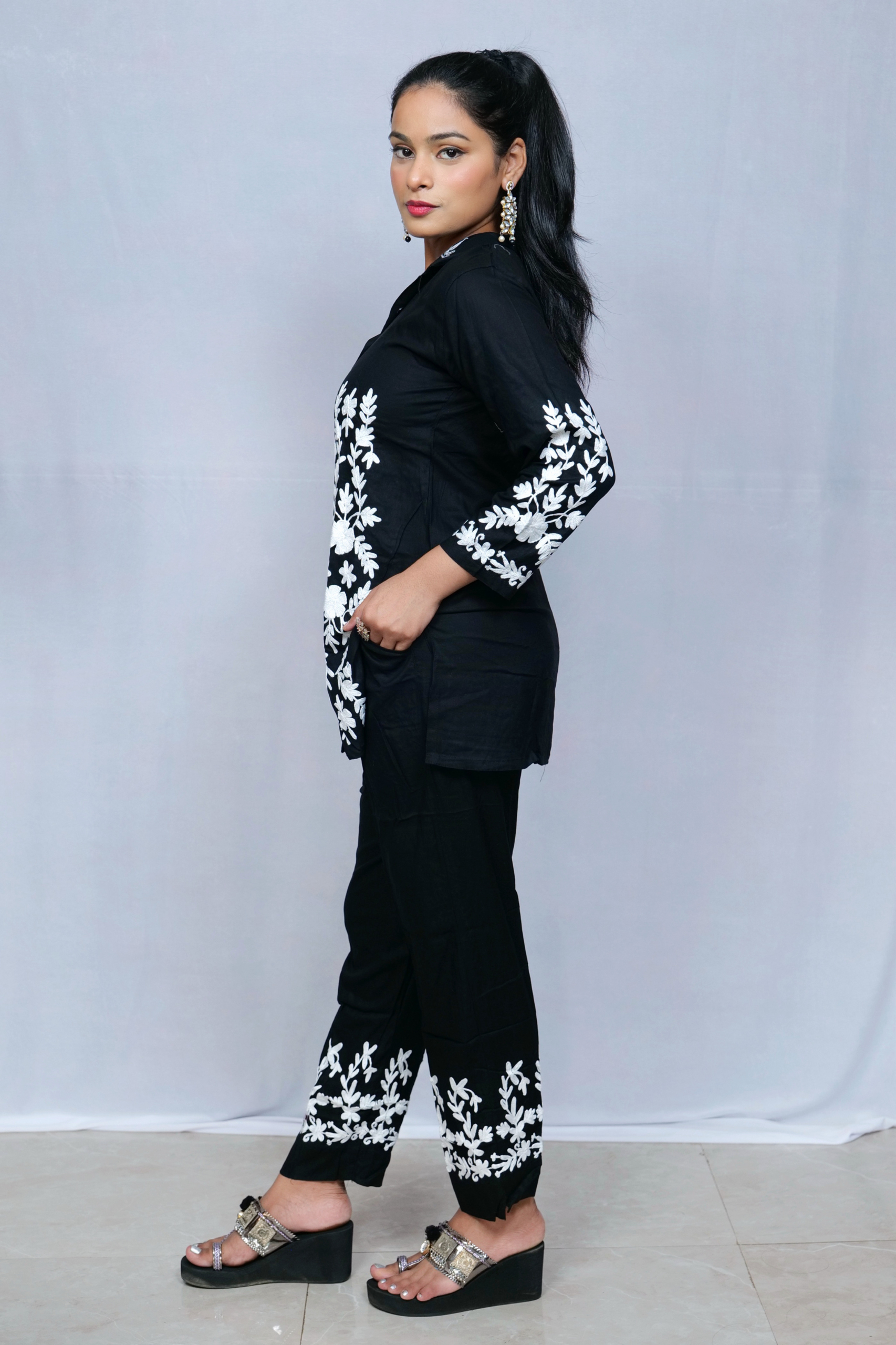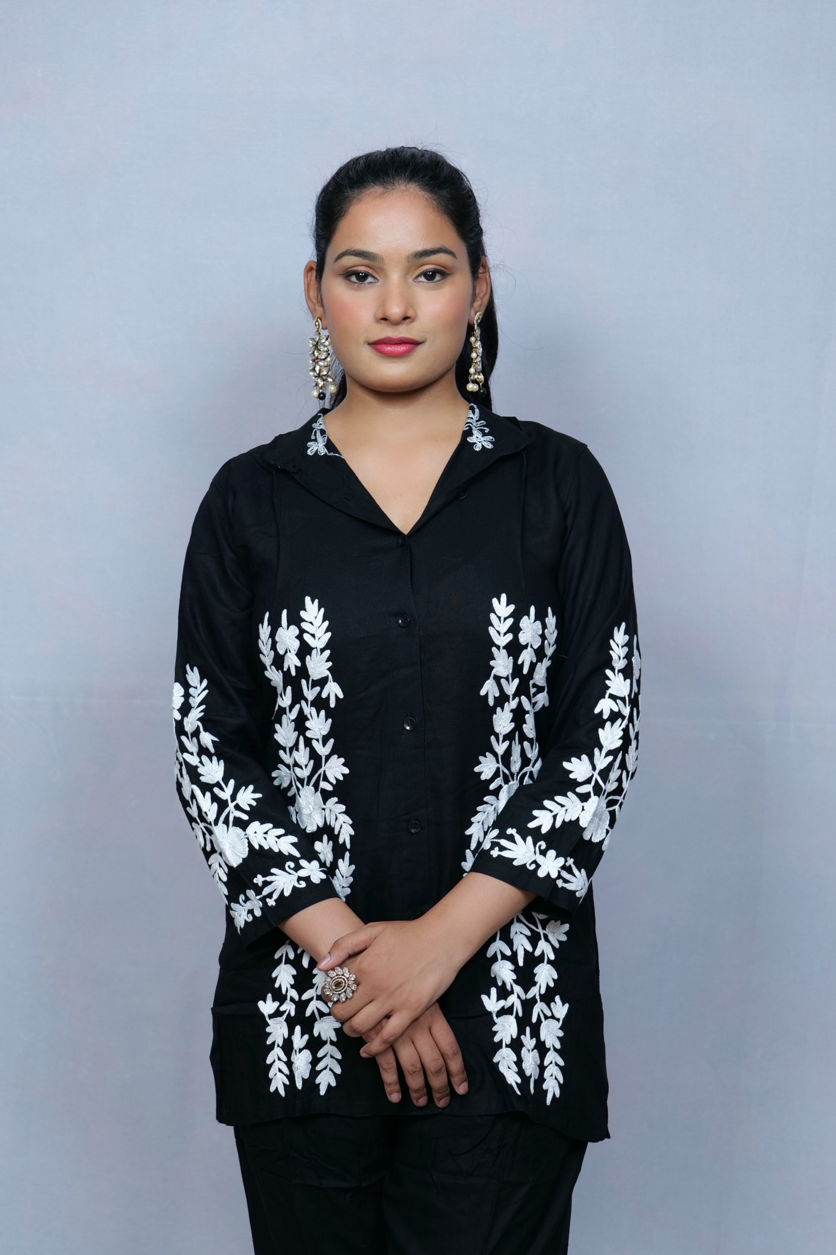 Redefine ethnic elegance with a modern twist in this black Chikankari coord set from Lucknavi Adaa. Featuring a collared shirt-style top with front buttons and matching straight pants, the outfit is elevated with exquisite white thread embroidery. Perfect for festive gatherings, office parties, or casual brunches—this set brings together comfort, confidence, and contemporary ethnic charm.
