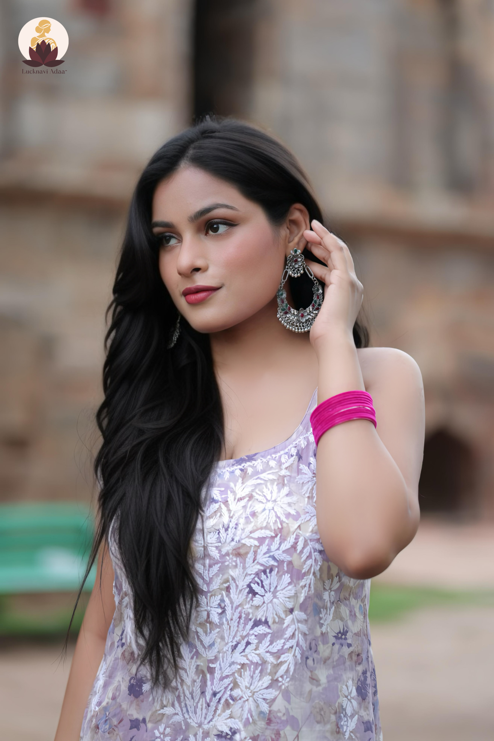 Turn heads effortlessly with this dreamy Mul Cotton Noodle Strap Kurti & Plazzo Set from Lucknavi Adaa. Designed in soothing lavender tones with intricate white threadwork, this ensemble blends modern cuts with timeless elegance. The breezy noodle strap kurti adds a playful edge, while the flowy lazo pants bring unmatched comfort — perfect for sunny days, festive moods, or your next Insta-worthy outing!