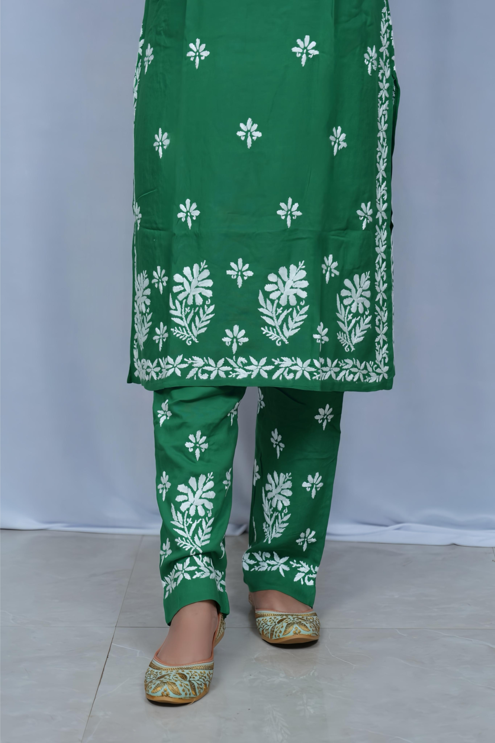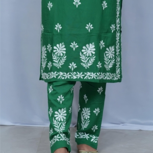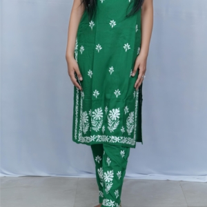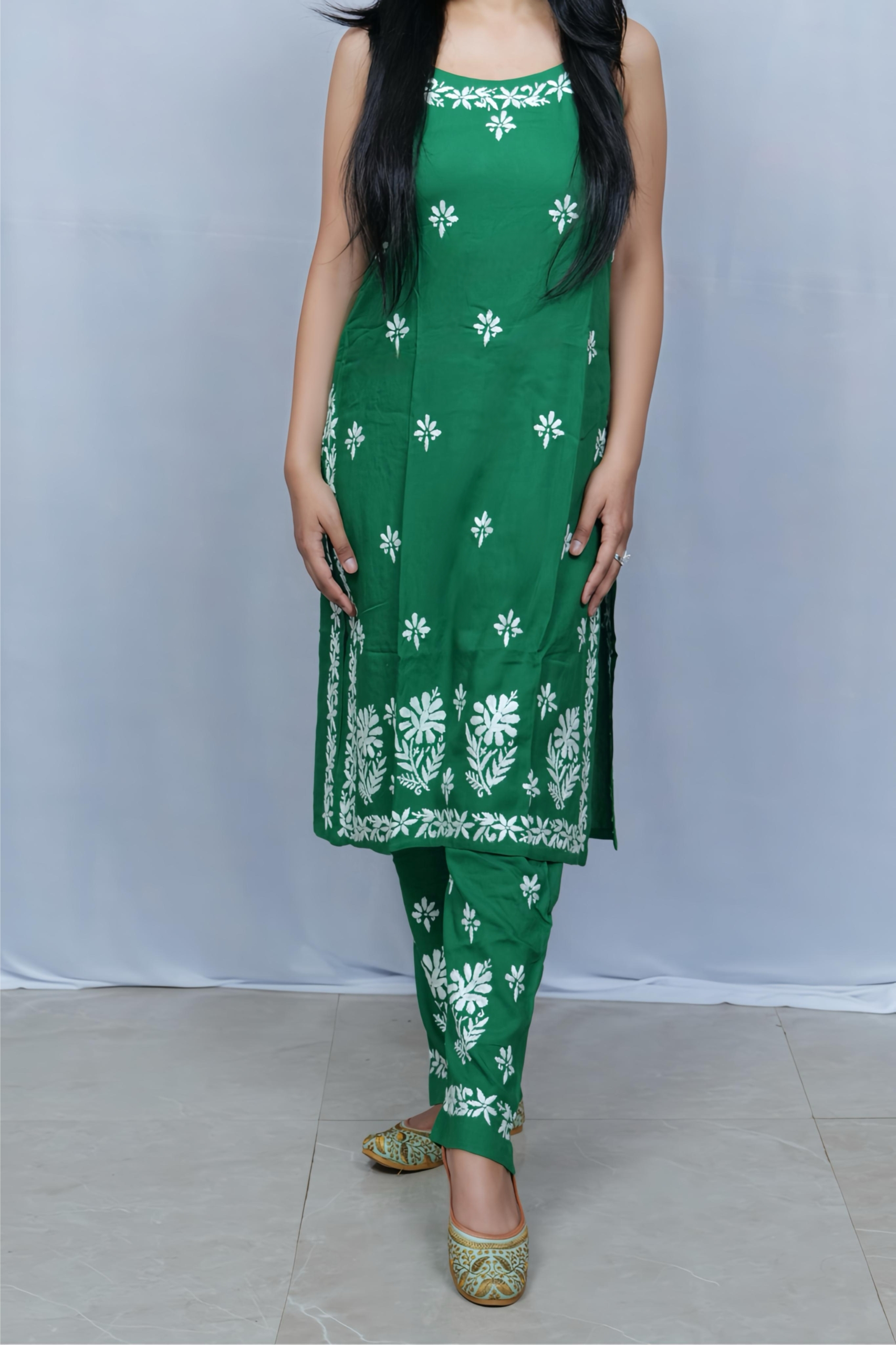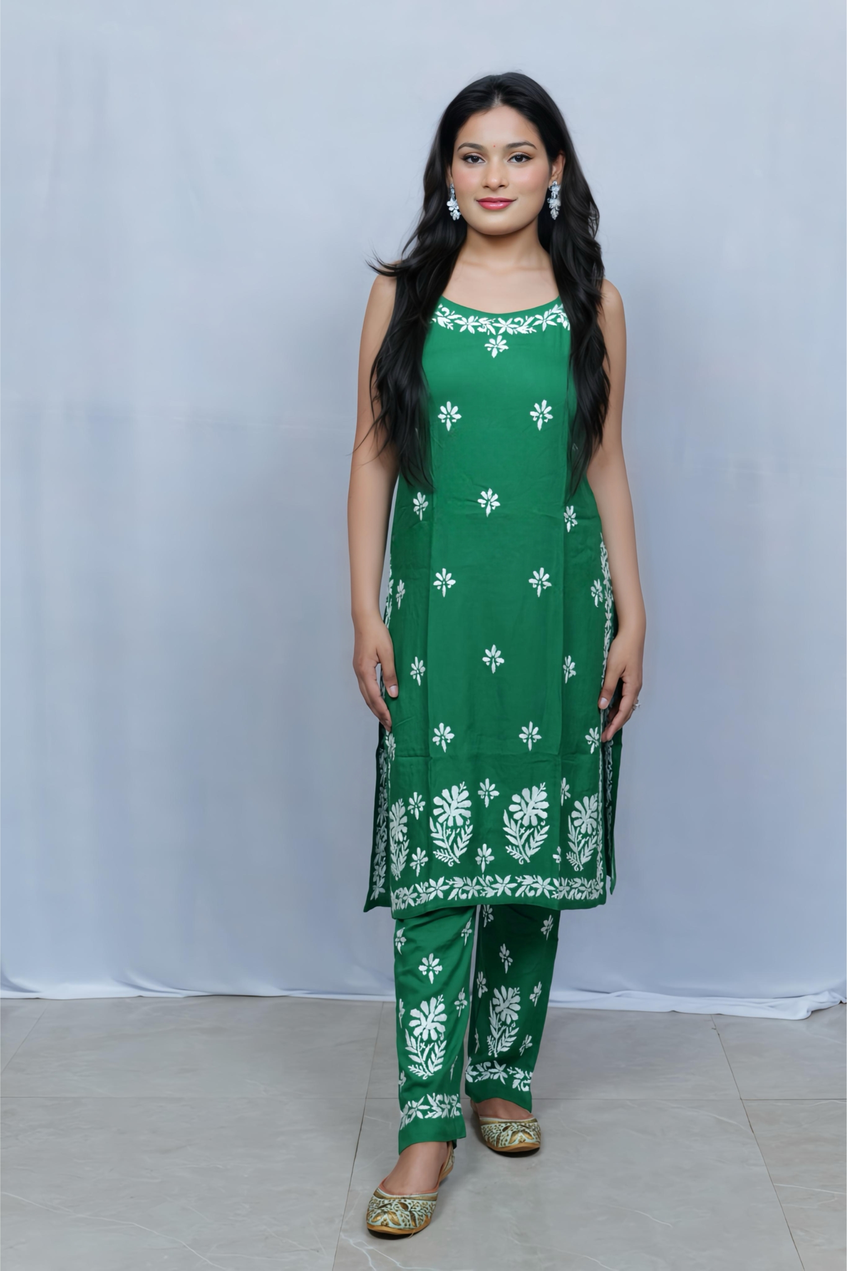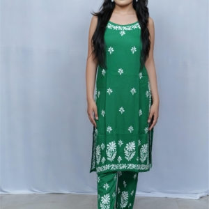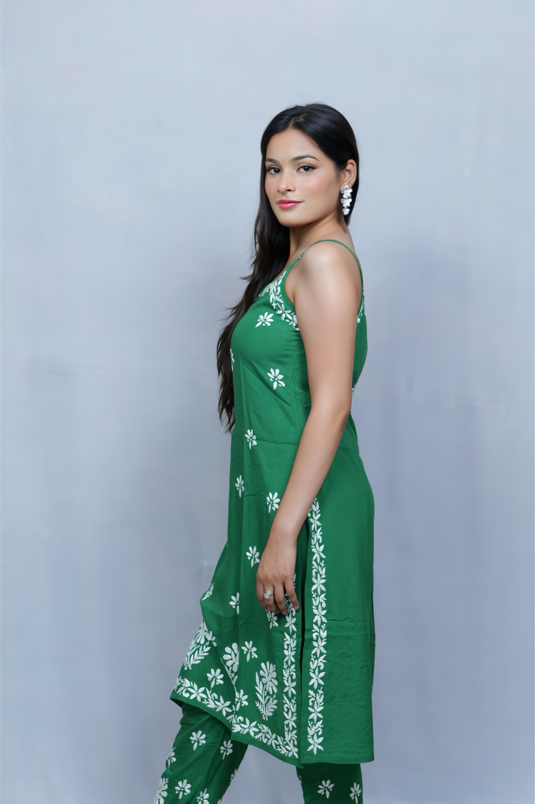 Beat the heat in style with this vibrant green noodle strap kurti and palazzo set by Lucknavi Adaa. Adorned with graceful white thread embroidery, the sleeveless kurti adds a modern edge, while the matching palazzo completes the look with elegance. A perfect pick for festive brunches, casual outings, or relaxed summer wear!