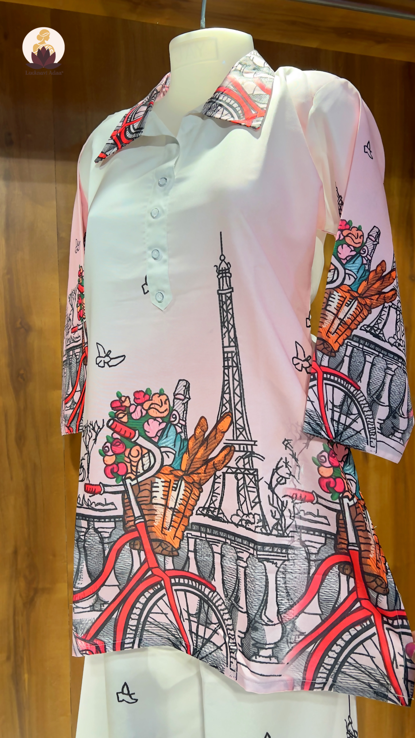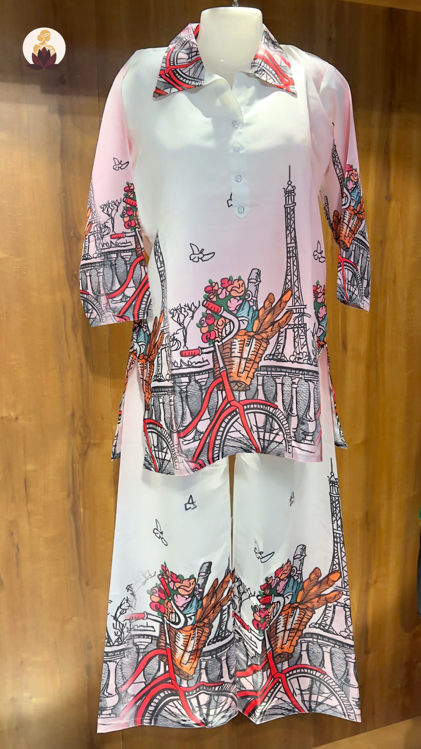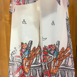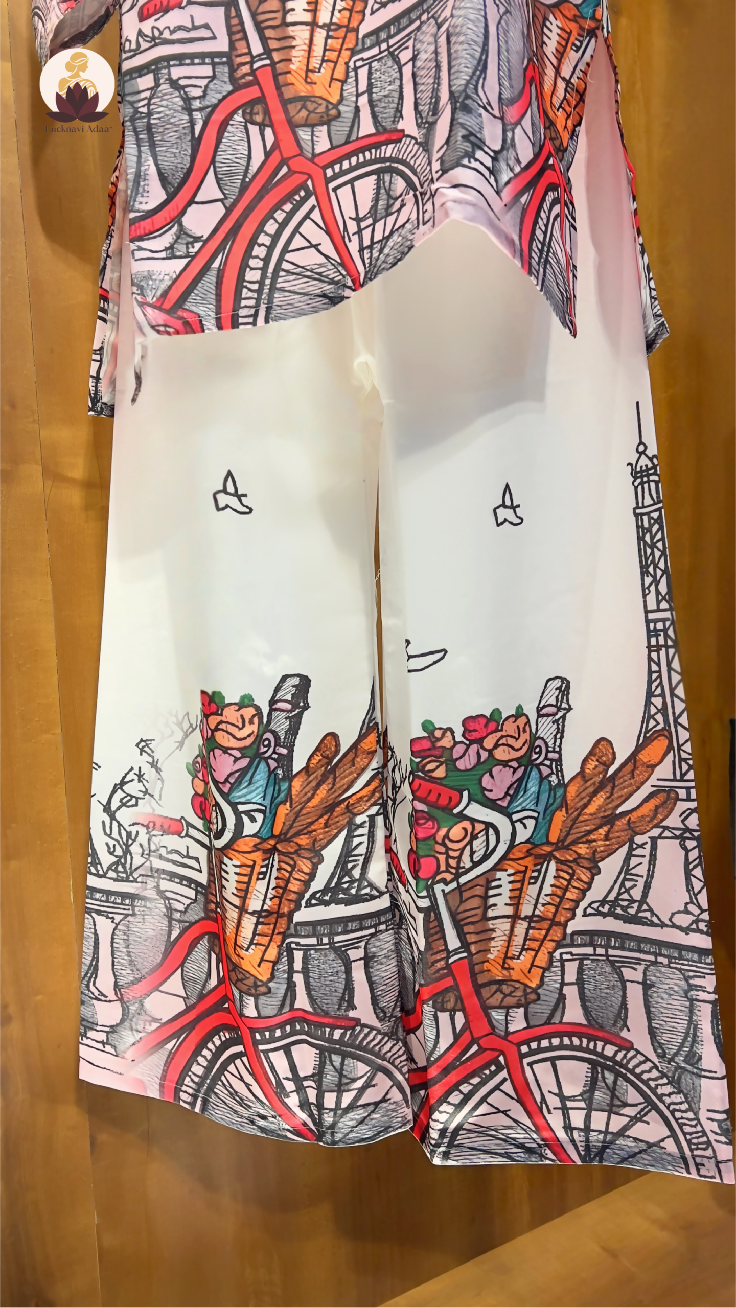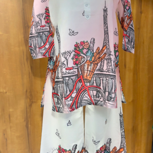 Featuring a chic collared top with button details and wide-legged bottoms, this set showcases a dreamy Paris-inspired print of bicycles, florals, and the iconic Eiffel Tower. The pastel base with pops of vibrant red makes it a perfect blend of casual comfort and statement fashion. Ideal for brunches, vacations, or stylish everyday wear, this co-ord set is designed to keep you looking elegant and trendy with zero effort.