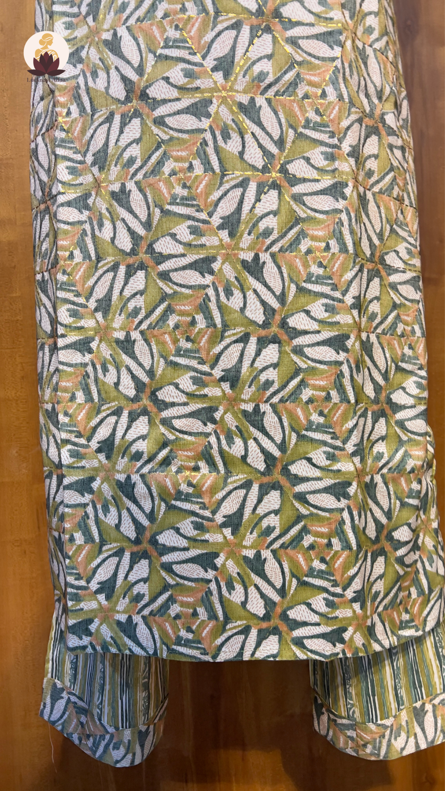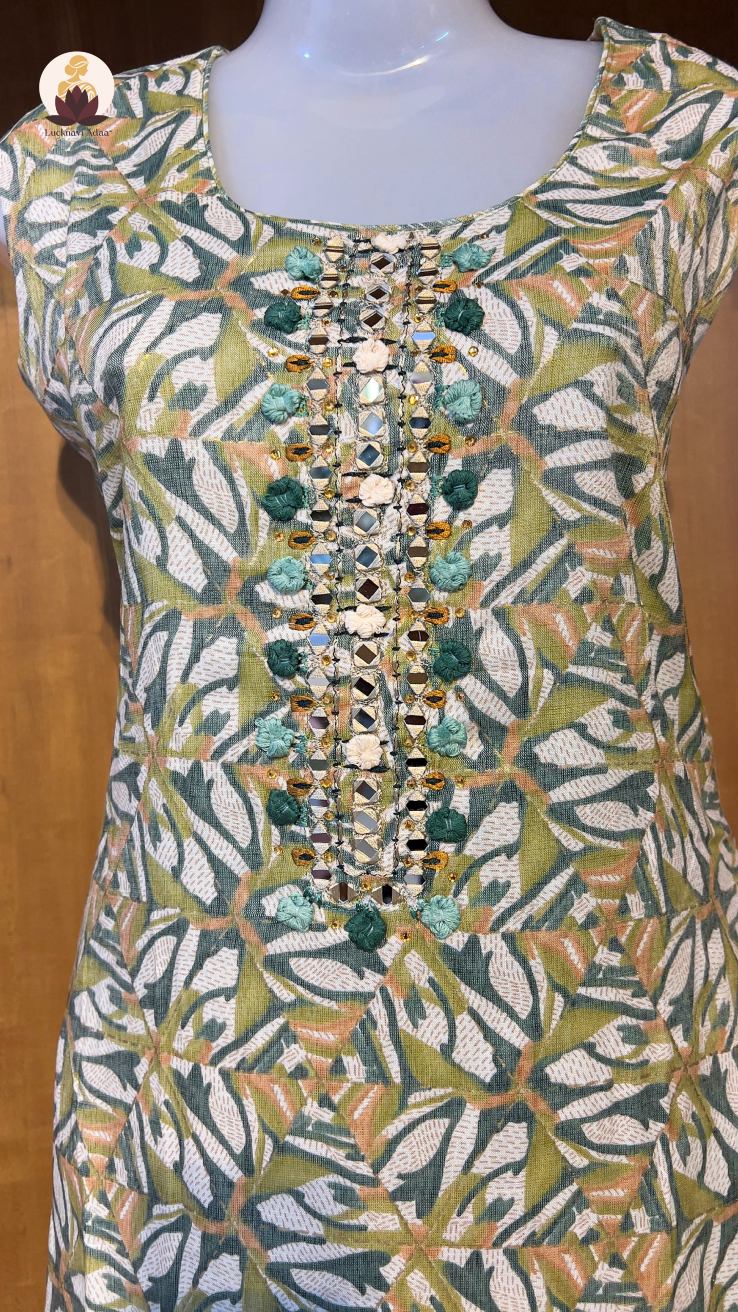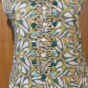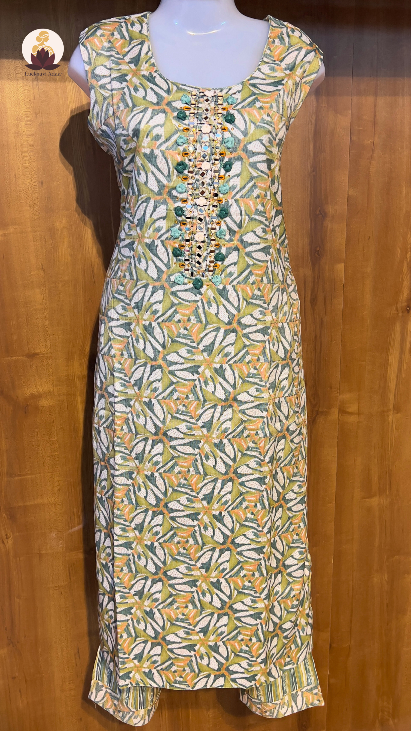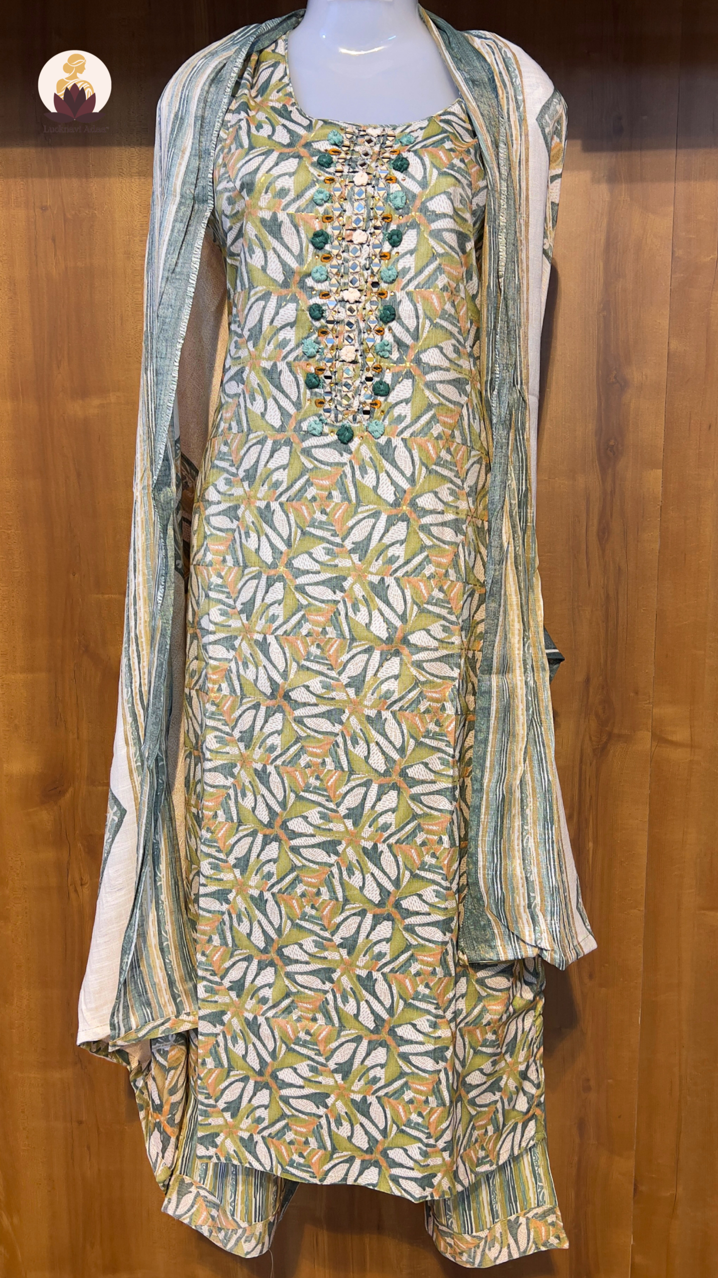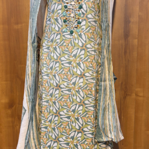 Bring a pop of freshness to your festive and everyday style with this vibrant printed suit set. Designed with a leafy pastel green and mustard pattern, the kurta is beautifully adorned with mirror and threadwork on the neckline for that subtle sparkle. Paired with a striped dupatta and matching bottoms, this set is all about playful prints meeting effortless comfort. Whether you’re heading for brunch, a casual get-together, or a day at work, this outfit promises elegance with a fun twist.