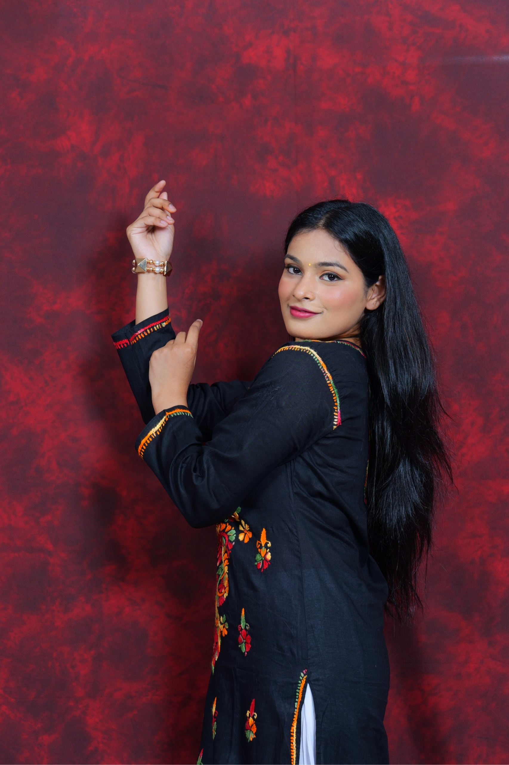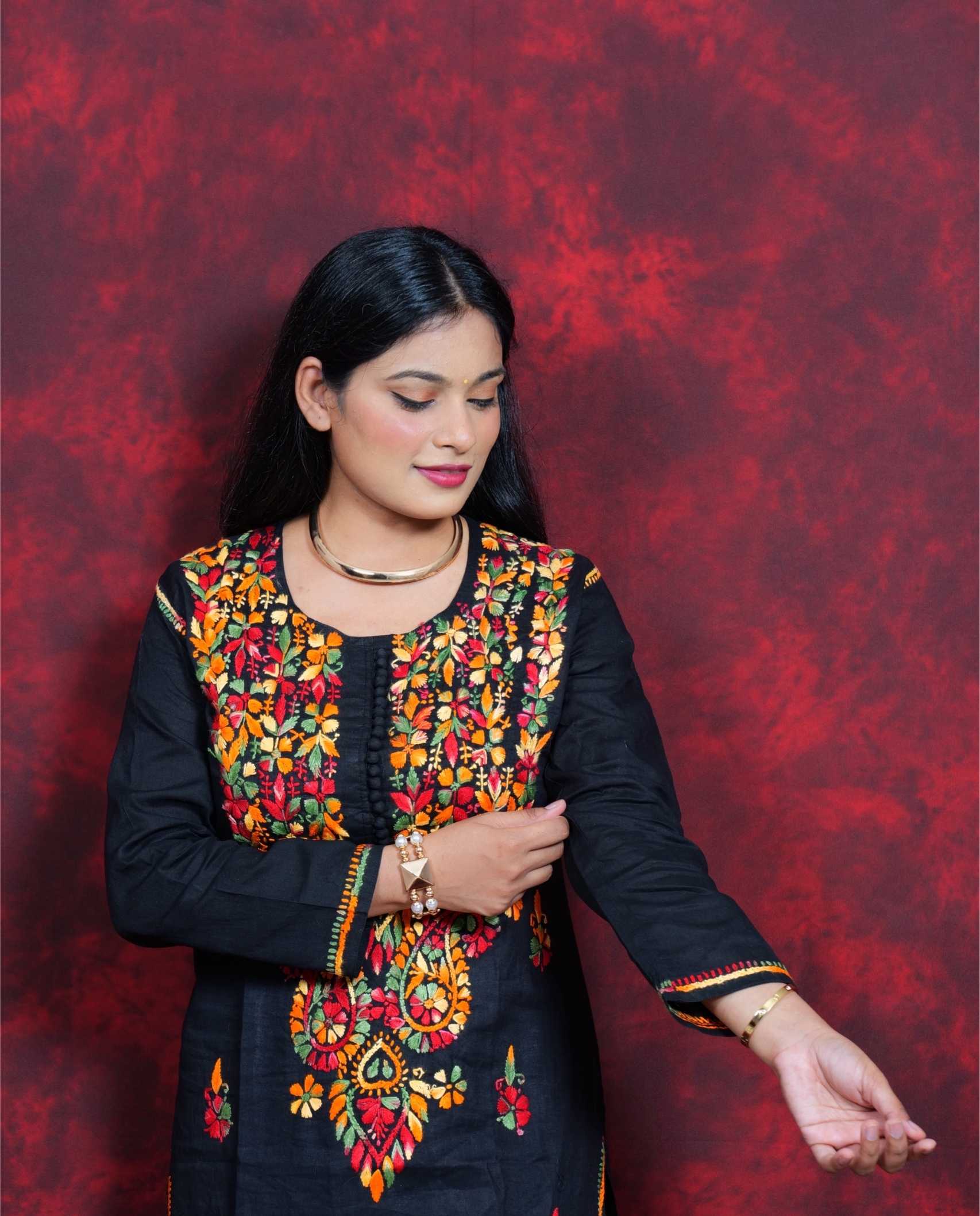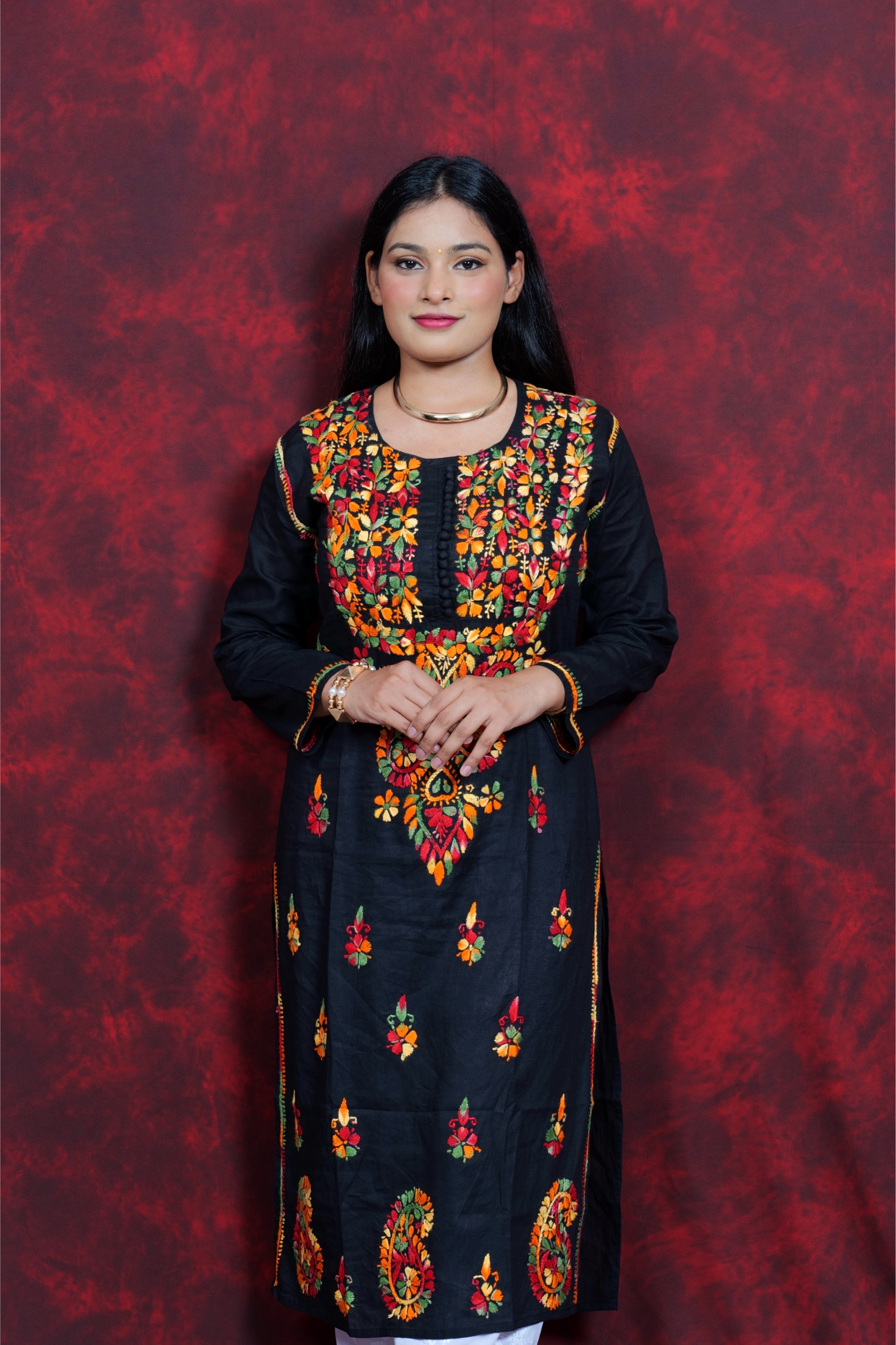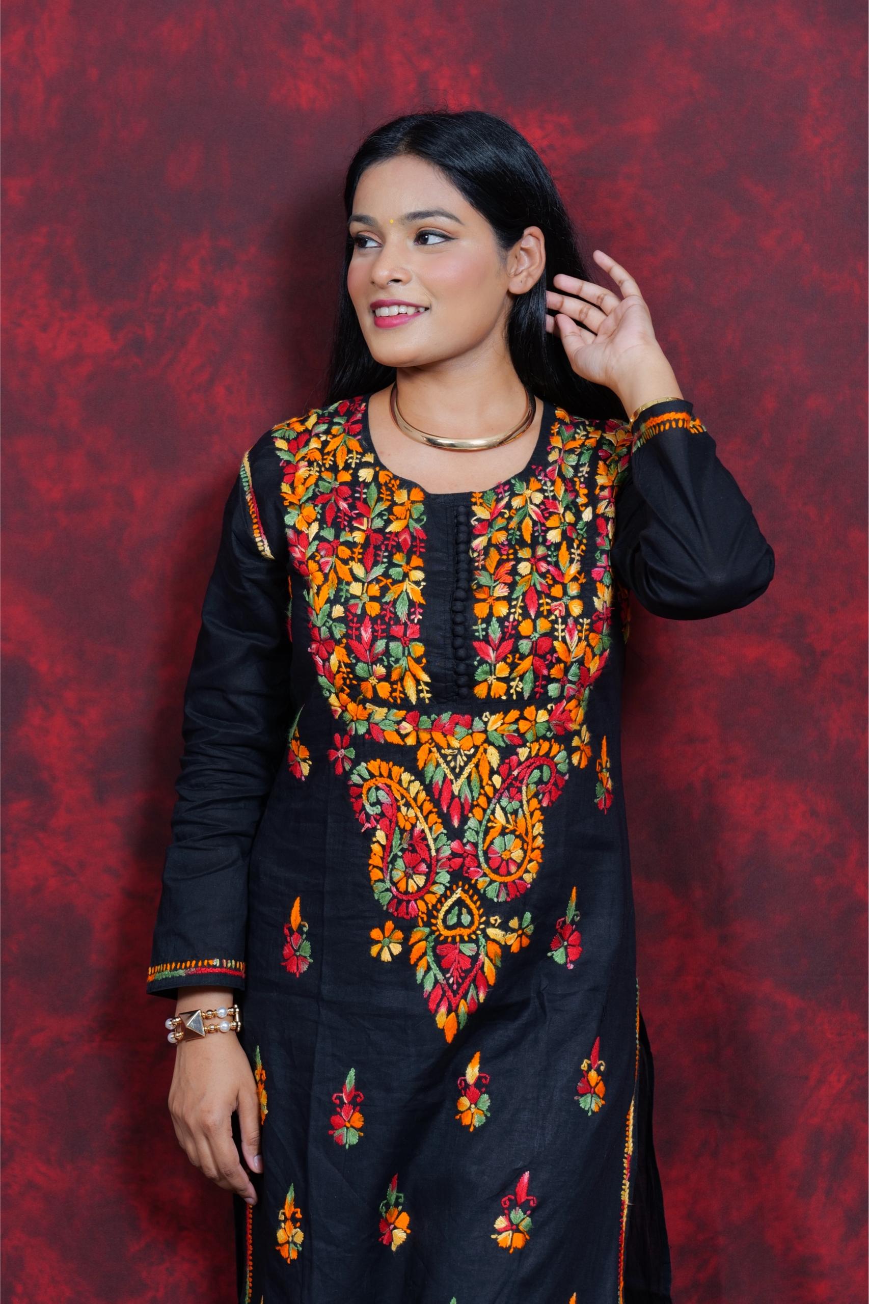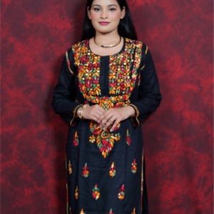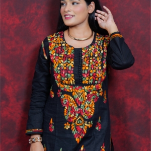 Bring home a splash of tradition with this beautifully handcrafted multicolor kurti from Lucknavi Adaa. Made from breathable pure cotton, it features vibrant thread embroidery that stands out effortlessly on a deep black base. Whether you’re heading to work, a festive gathering, or a casual meet-up, this kurti blends grace with comfort — perfect for the modern woman who loves ethnic wear with a bold twist..