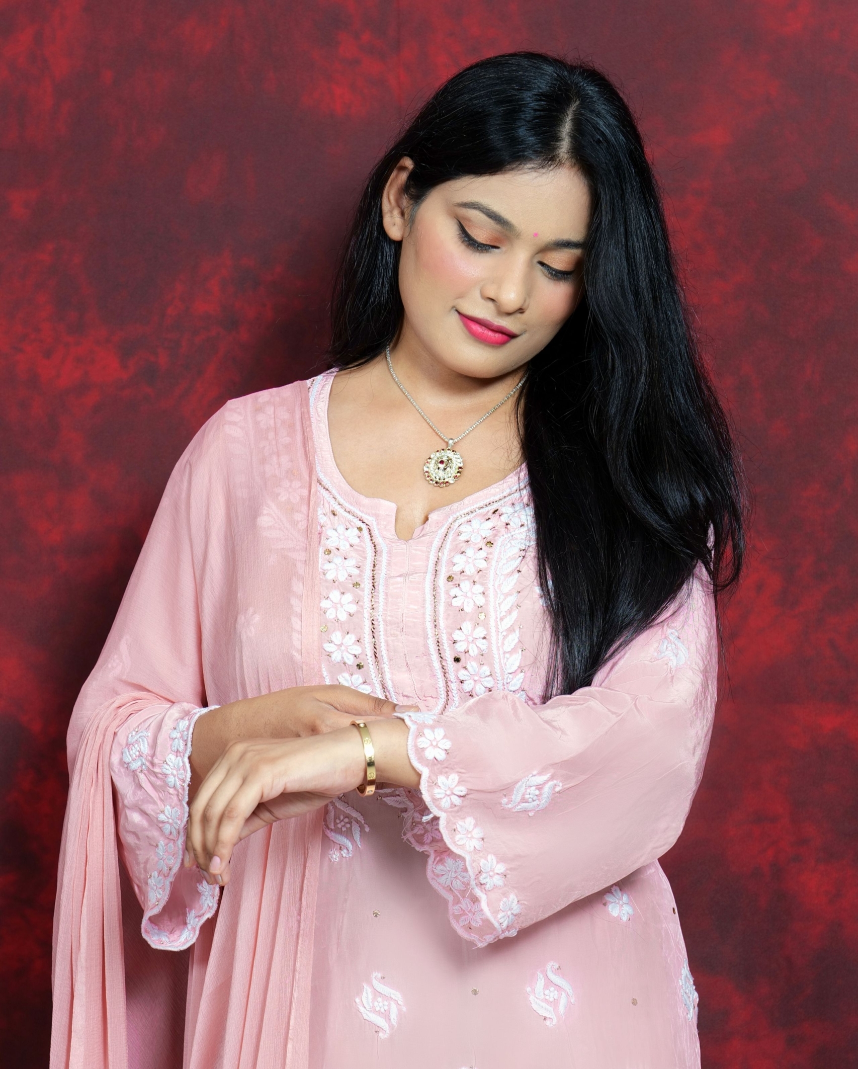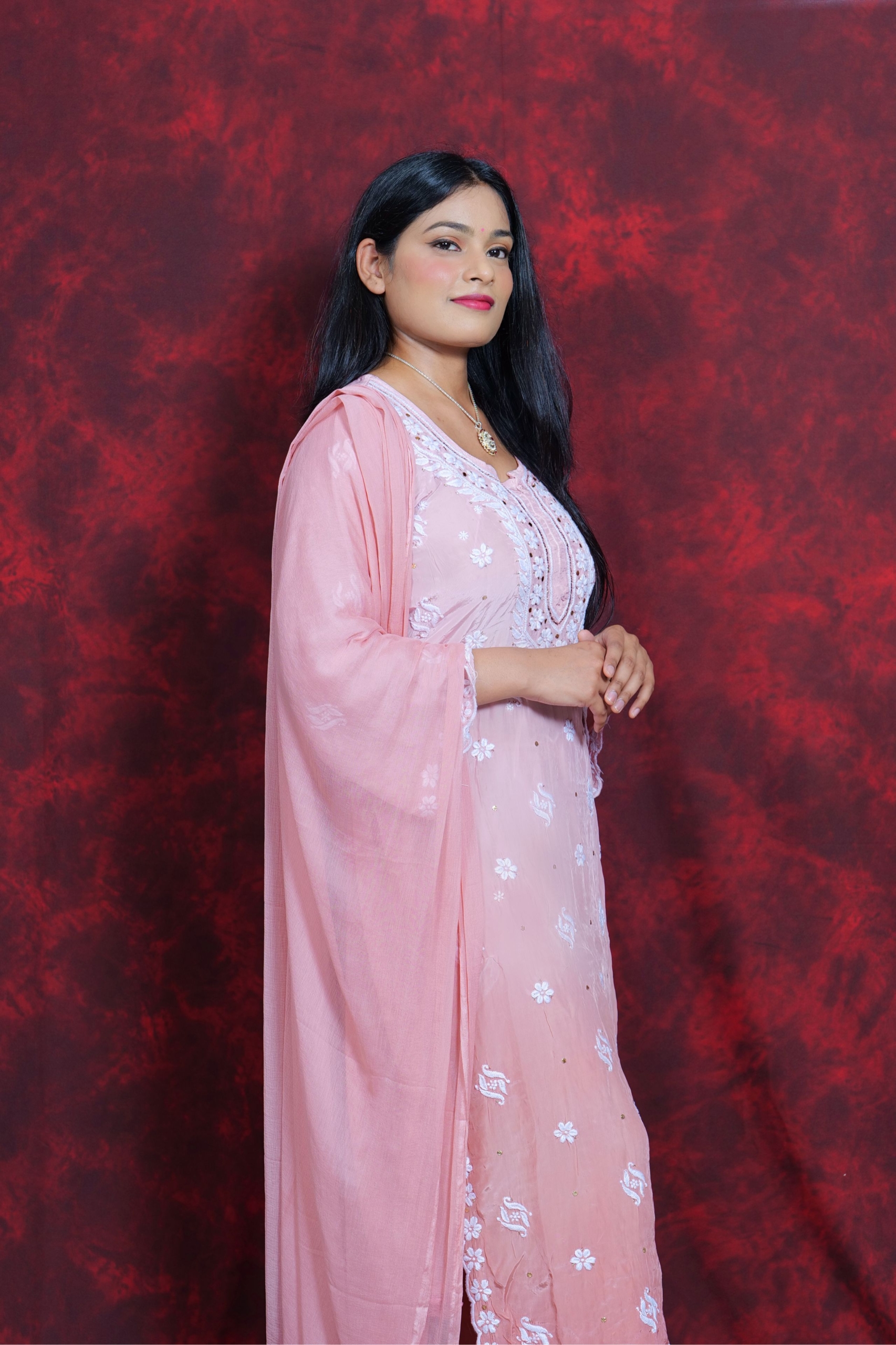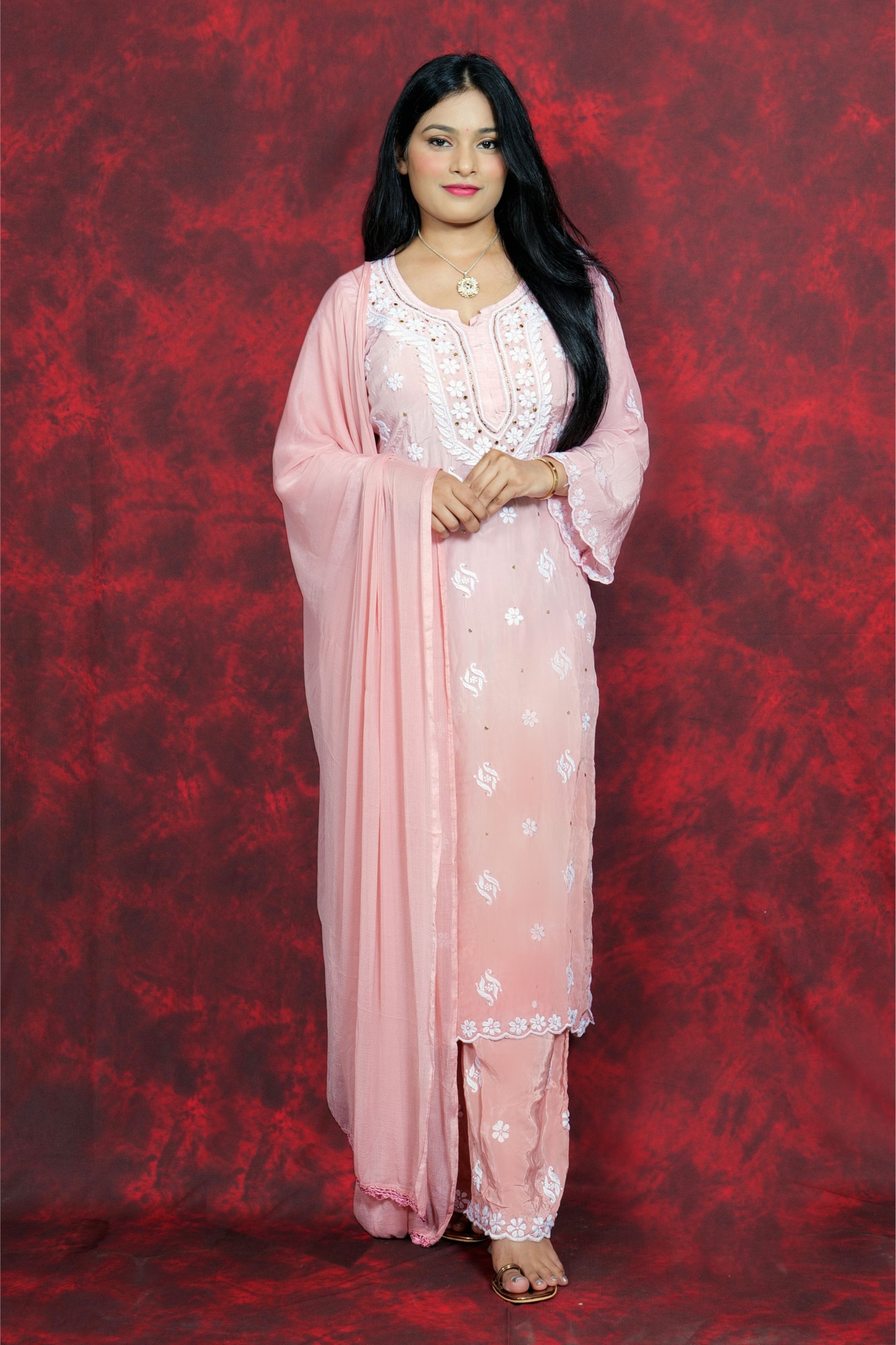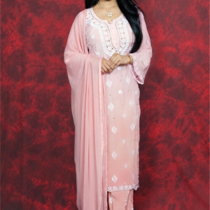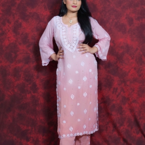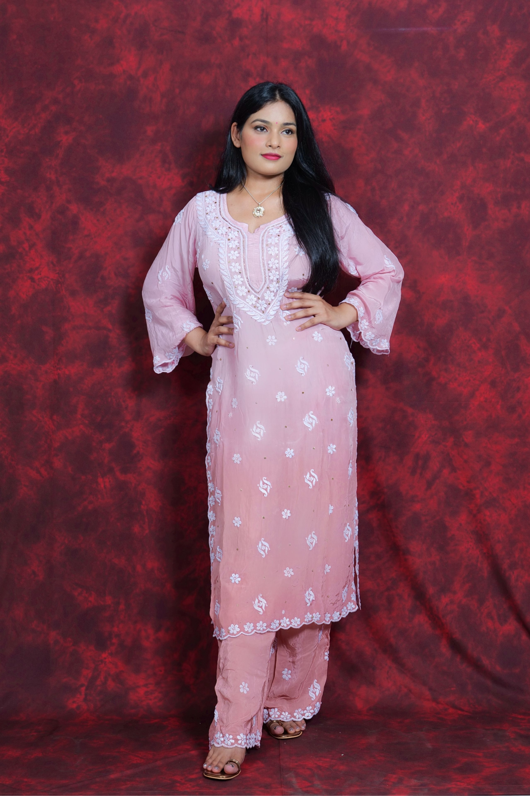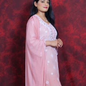Delicate, dreamy, and rooted in tradition — this blush pink Chikankari suit is pure elegance. Featuring soft floral embroidery with subtle sequin hints, it’s designed to keep you glowing through poojas, get-togethers, or intimate celebrations. With a breezy silhouette and a timeless vibe, this outfit reflects the true essence of Lucknavi Adaa — handcrafted grace straight from Lucknow.