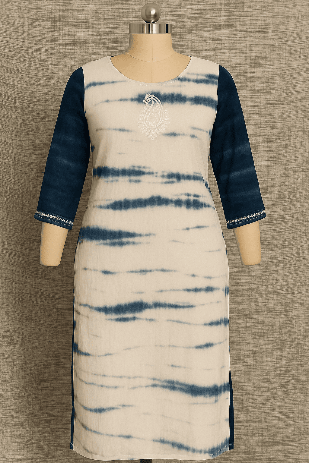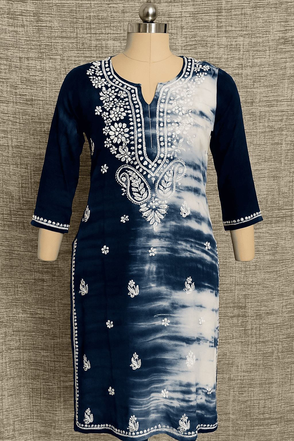 Make a bold yet elegant statement with this stunning navy and white Tie & Dye long kurti from Lucknavi Adaa. Crafted in soft, flowy rayon, it features traditional white embroidery over a trendy hand-dyed base. The mix of ethnic detailing and contemporary patterns makes it a perfect pick for festive get-togethers, office wear, or casual day-outs. Style it with palazzos or leggings for a chic, effortless look.
