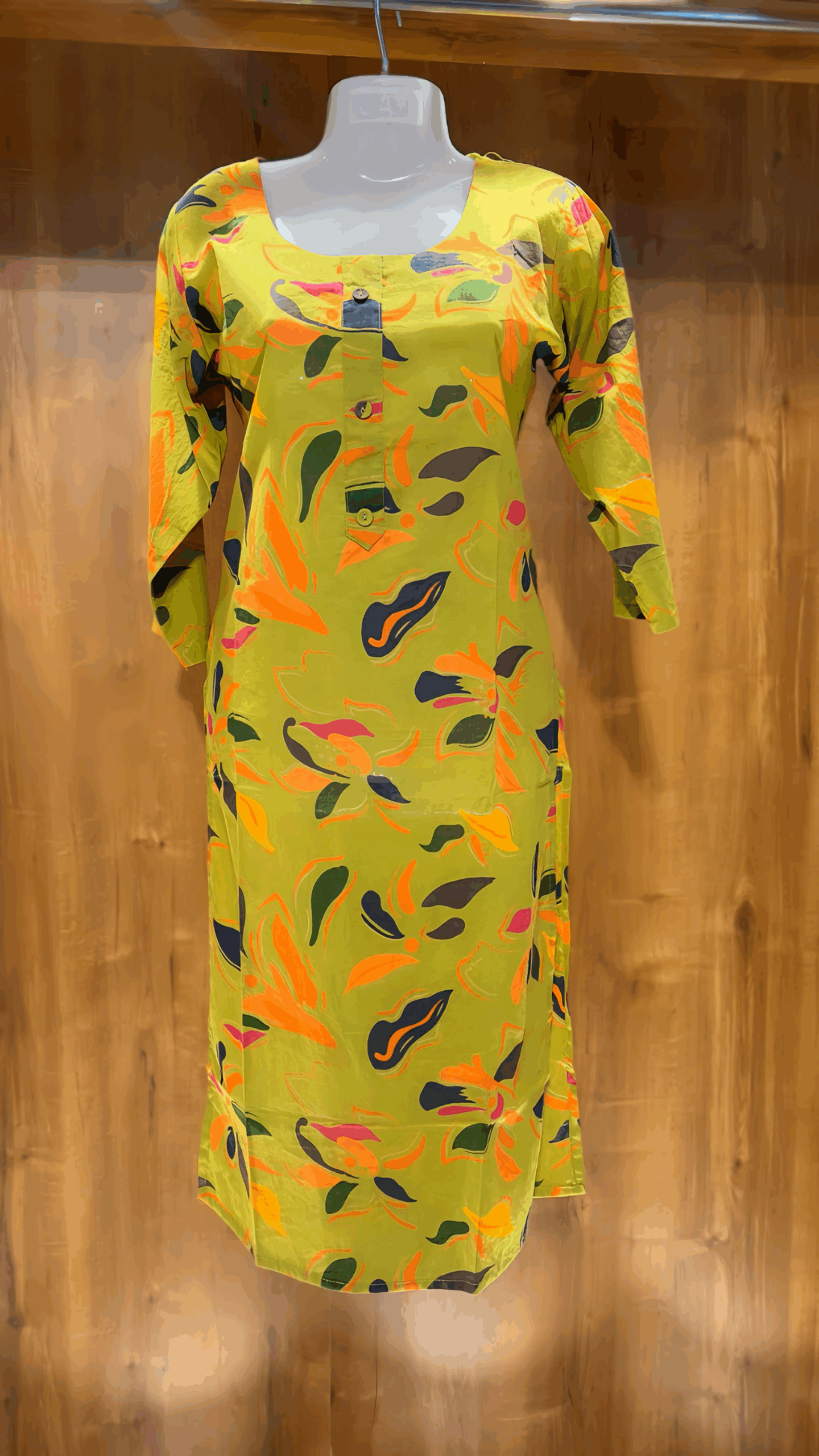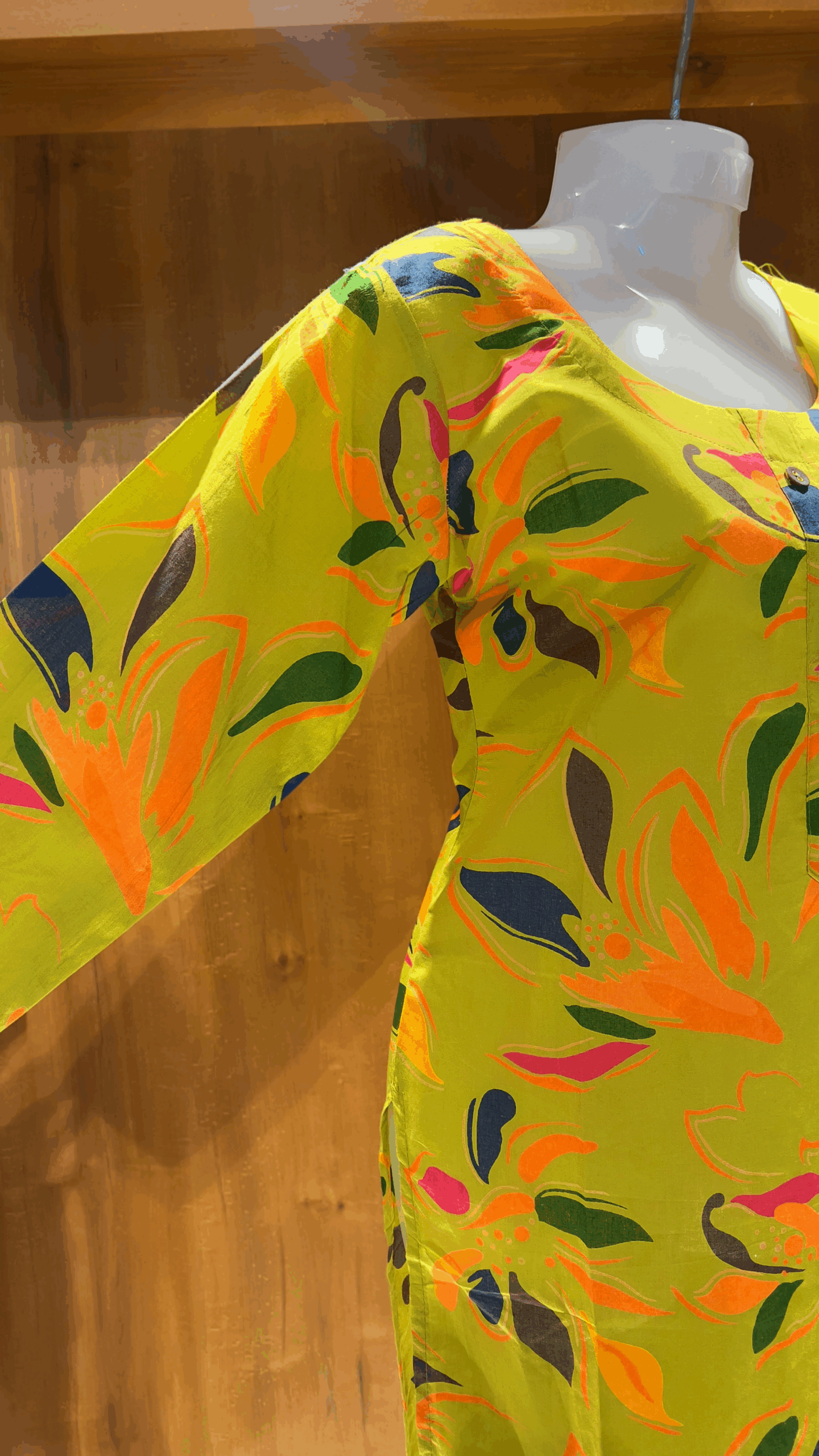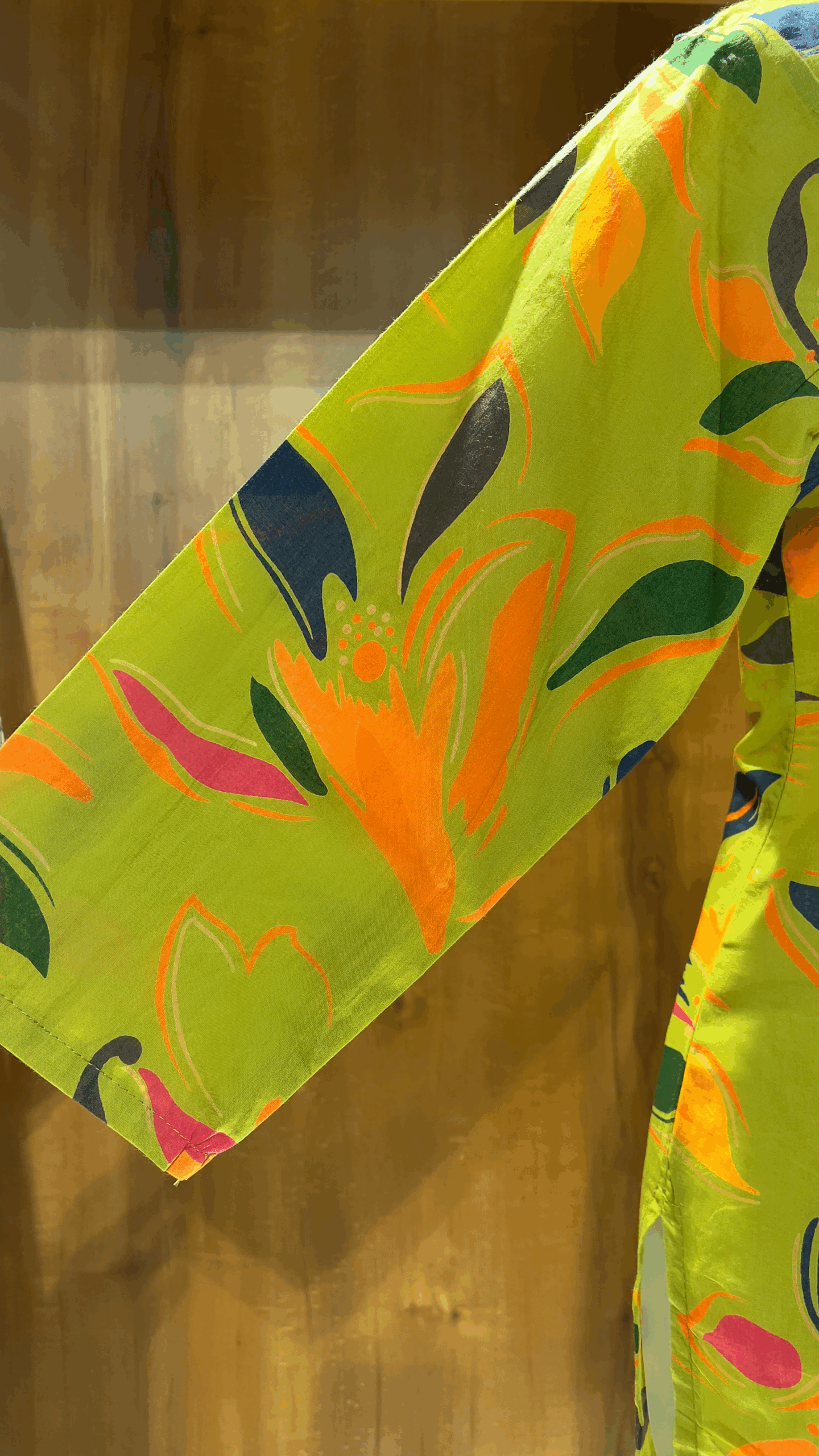 Add a splash of sunshine to your wardrobe with our Tropical Bloom Kurta in a zesty lime green base. Adorned with bold floral and abstract prints in vibrant hues, this kurta is the perfect pick for those who love to stand out. With its comfy silhouette and playful vibe, it’s your go-to outfit for office days, brunch plans, or casual outings.