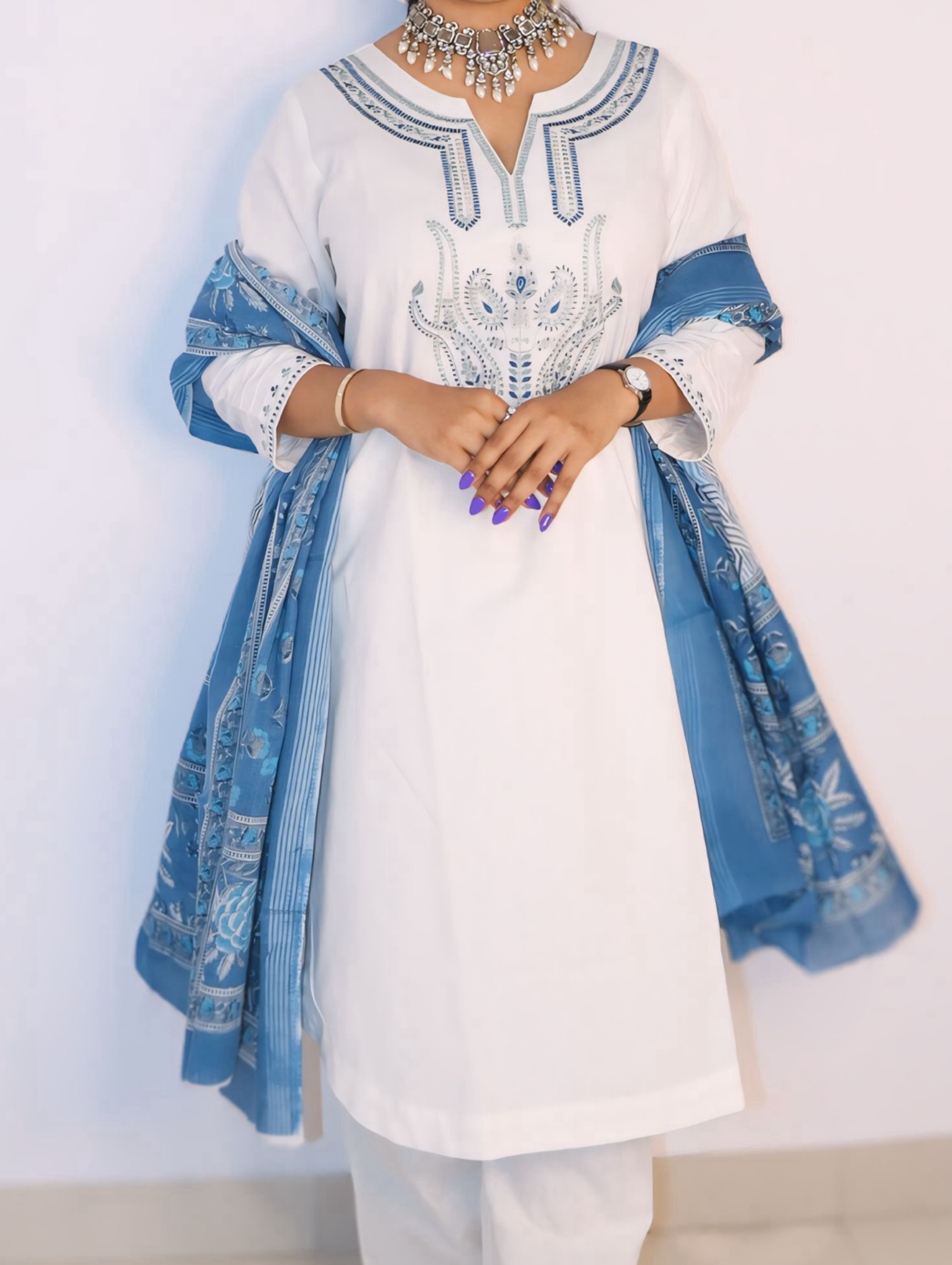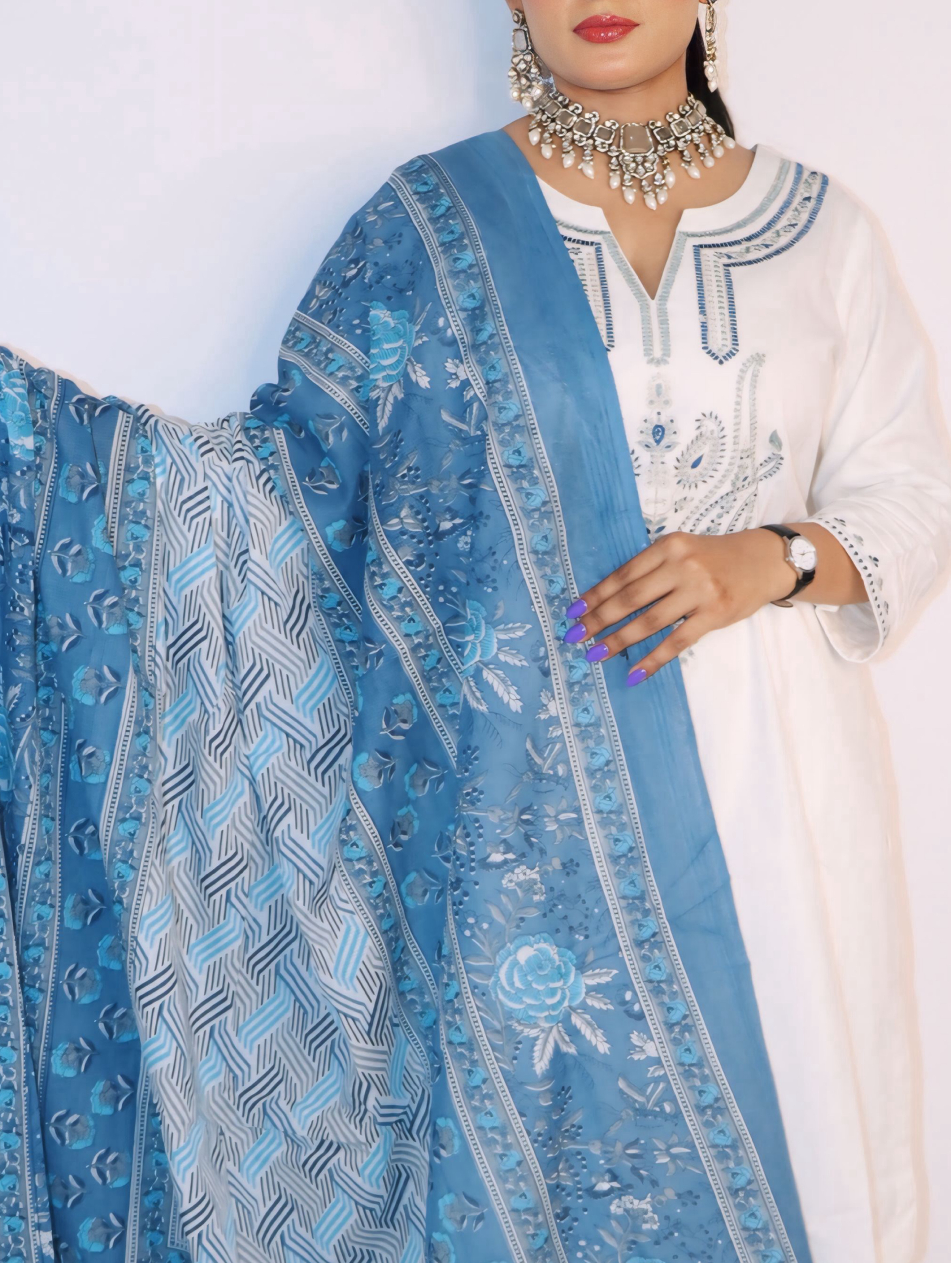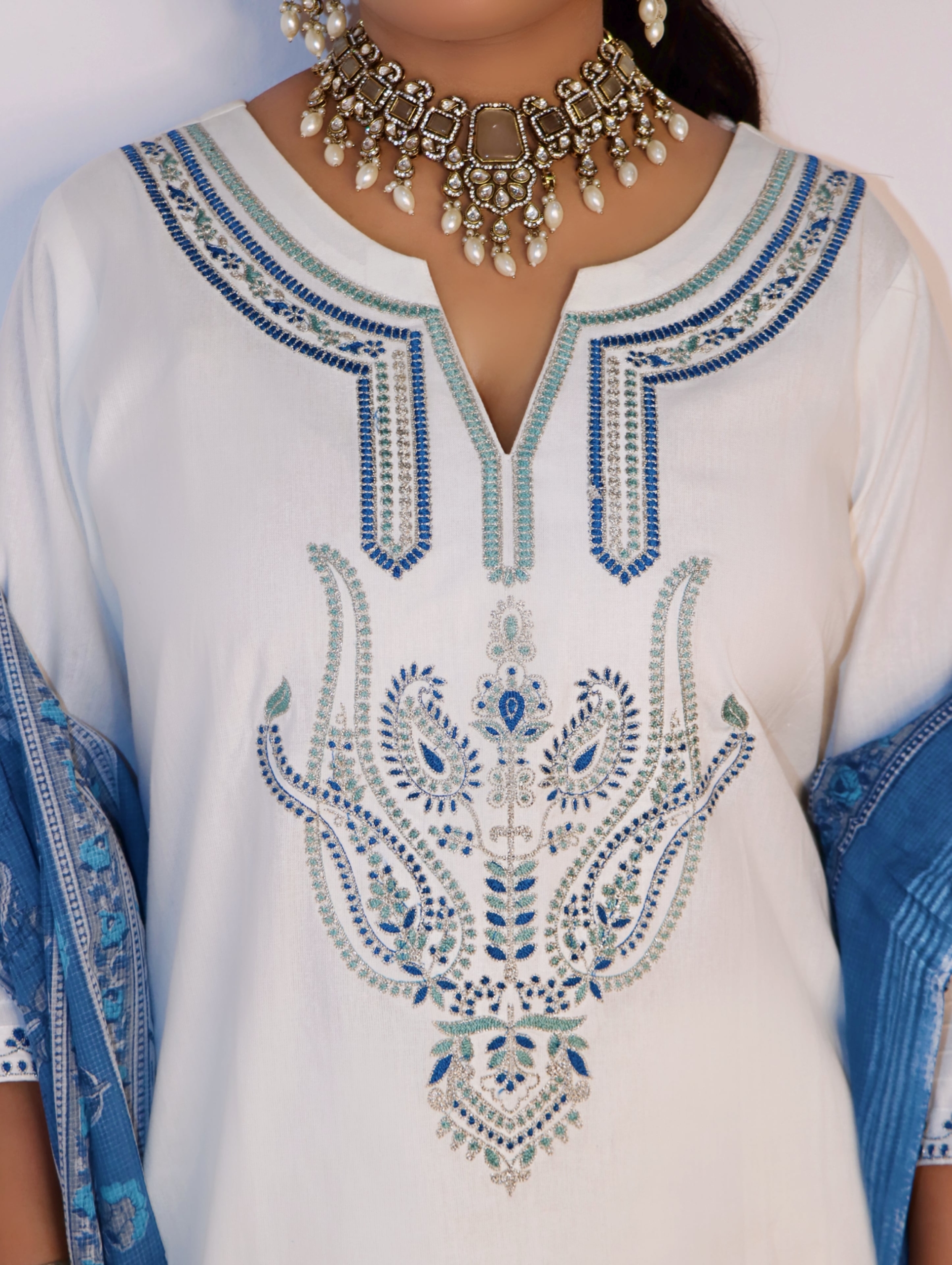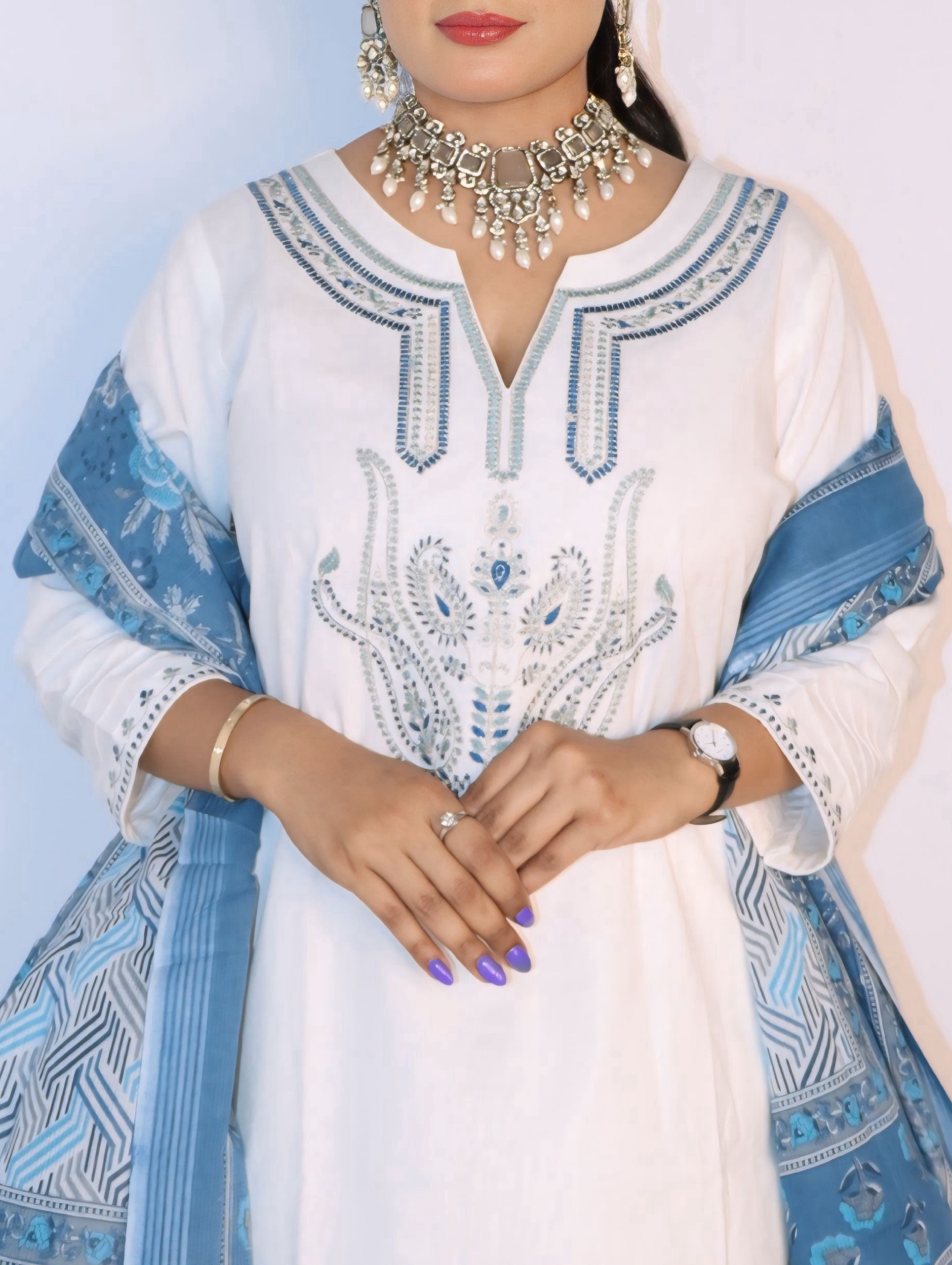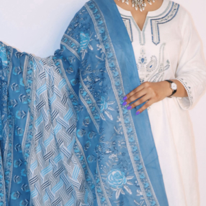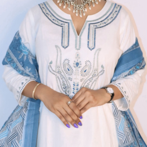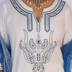 Refresh your ethnic wardrobe with Lucknavi Adaa’s White & Blue Embroidered Suit Set. The white kurta is beautifully highlighted with intricate blue embroidery and mirror accents, giving it a subtle festive sparkle.