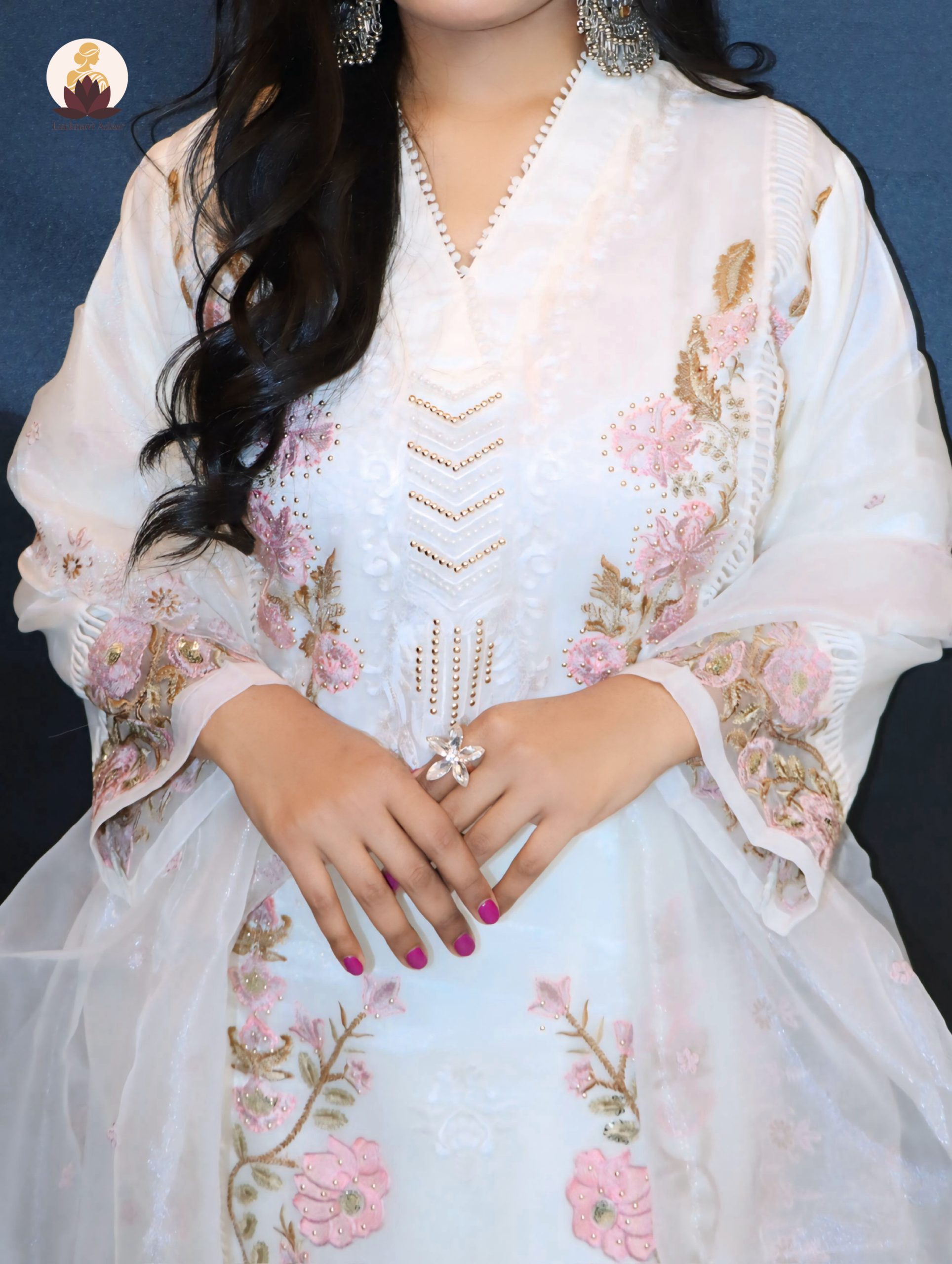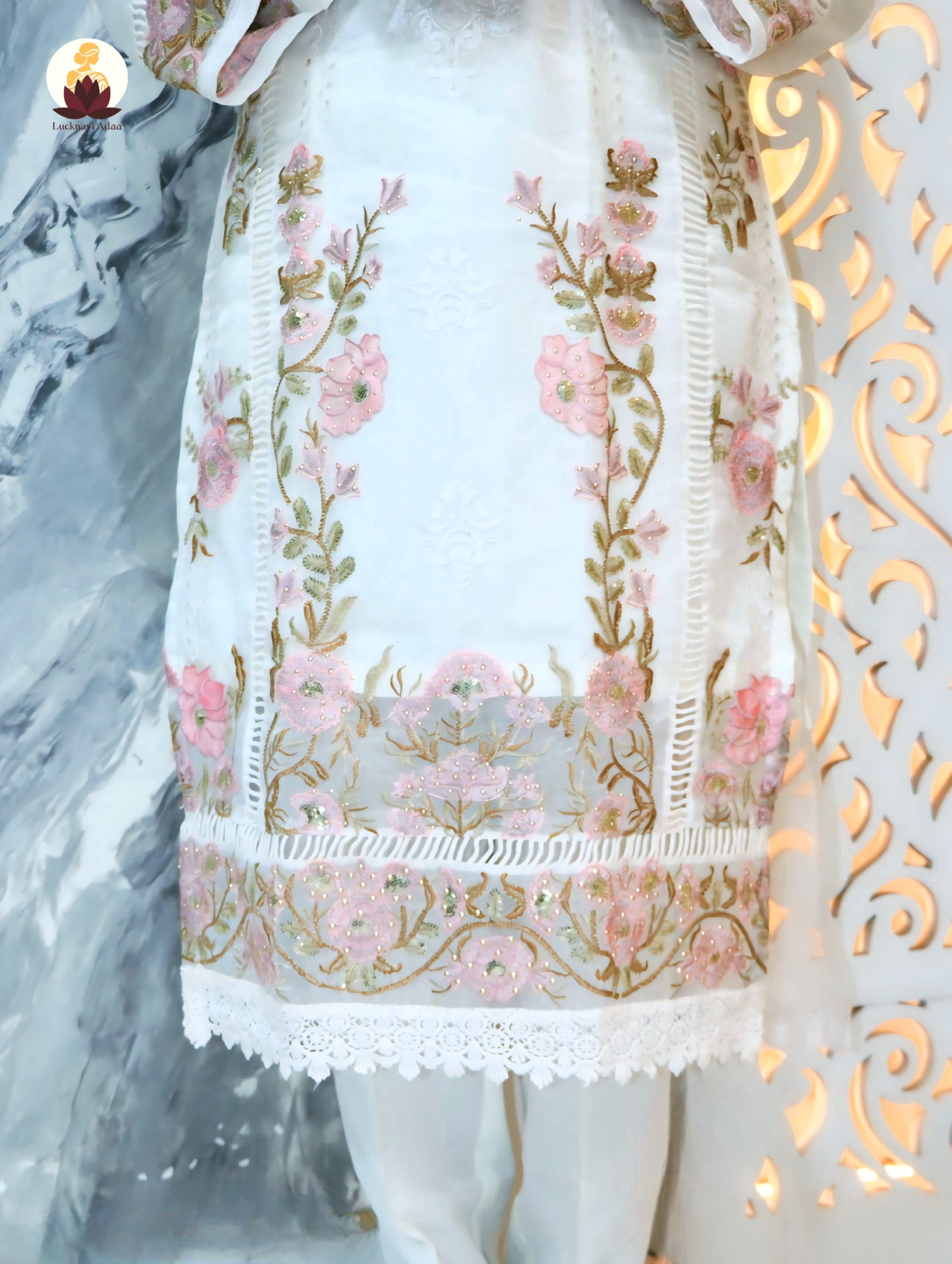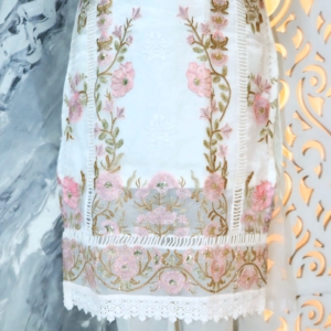 Crafted on a pure white base, this outfit is adorned with delicate pink floral embroidery and golden zari detailing, bringing together traditional charm and contemporary grace.