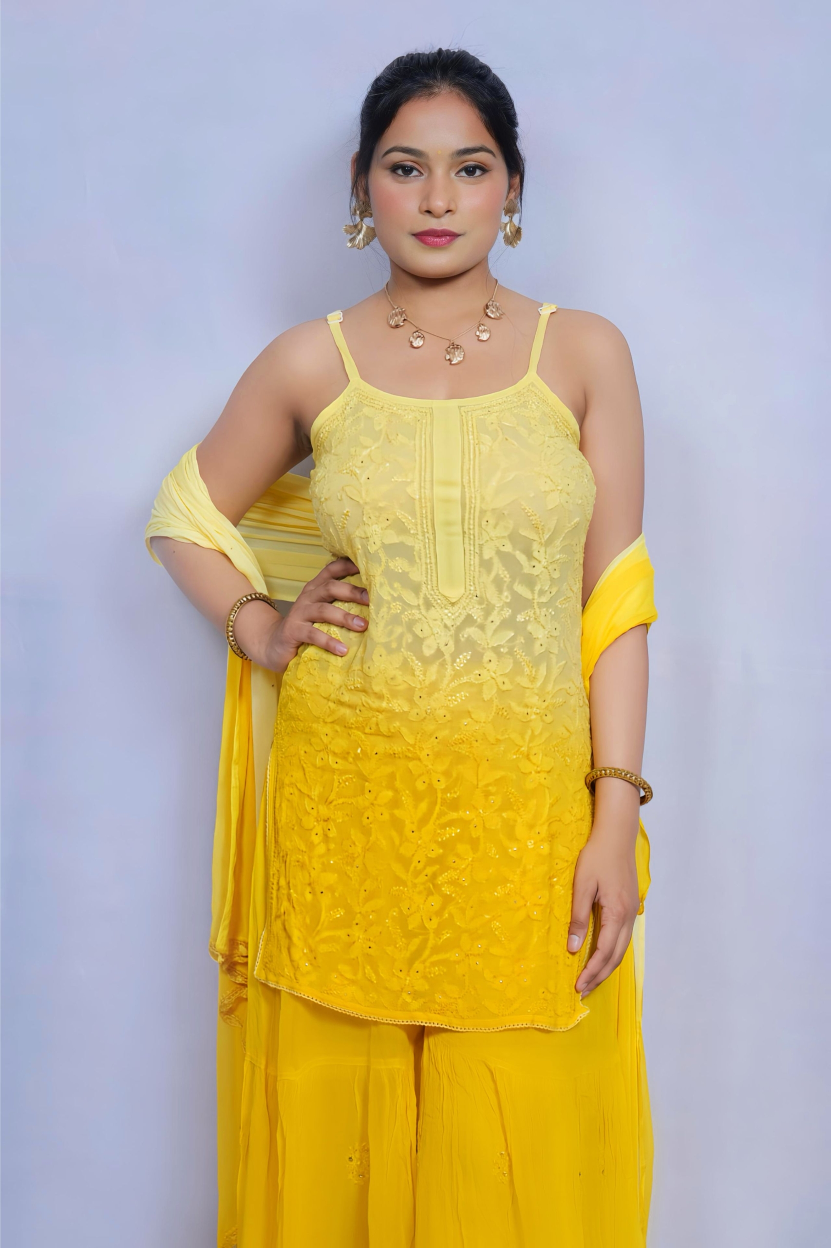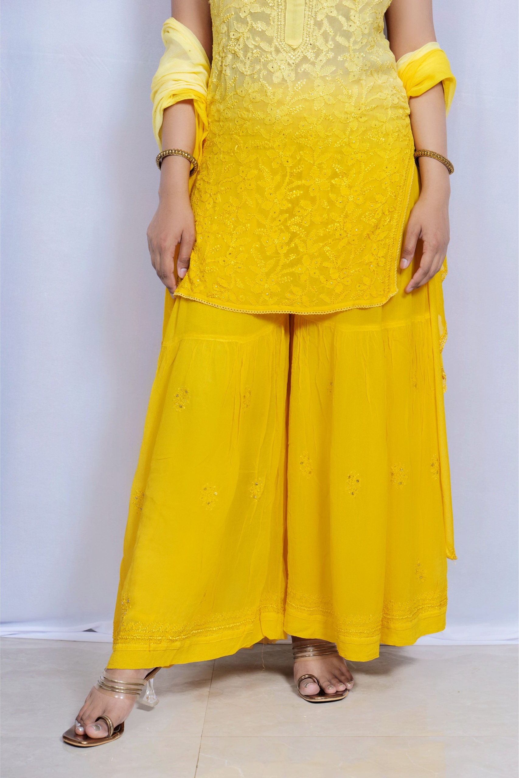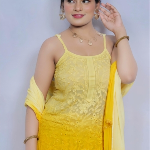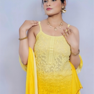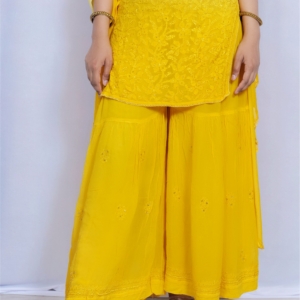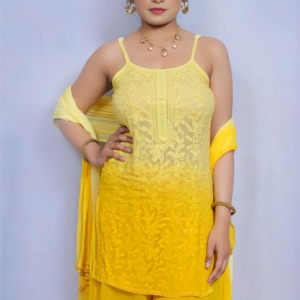 Bring sunshine to your wardrobe with this vibrant yellow Chikankari palazzo suit by Lucknavi Adaa. A perfect blend of grace and glow, this handcrafted piece features delicate embroidery with an ombré finish that flows effortlessly from light to bright. Whether it’s a festive day or a casual glam evening, this suit is all about comfort with charm.