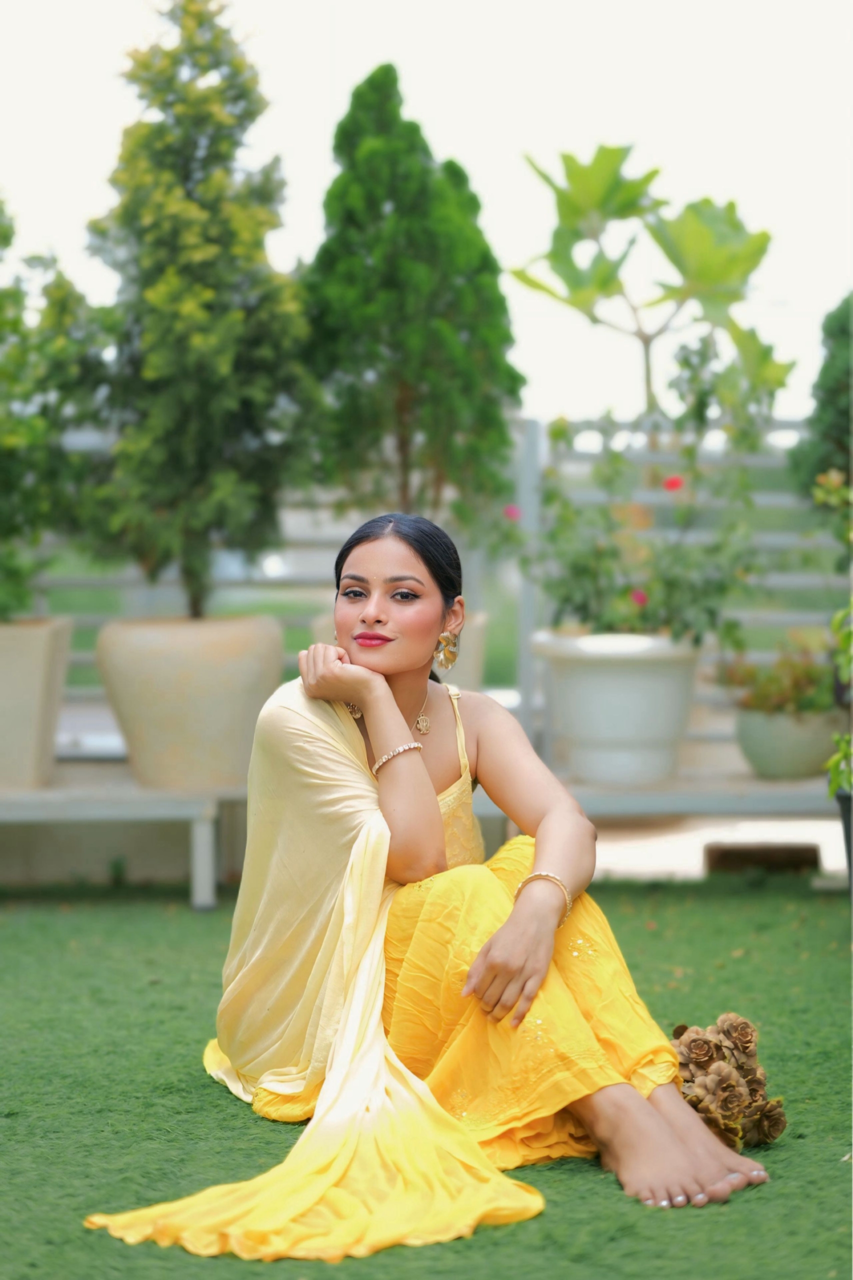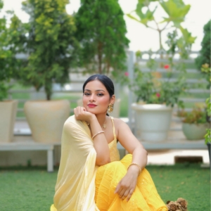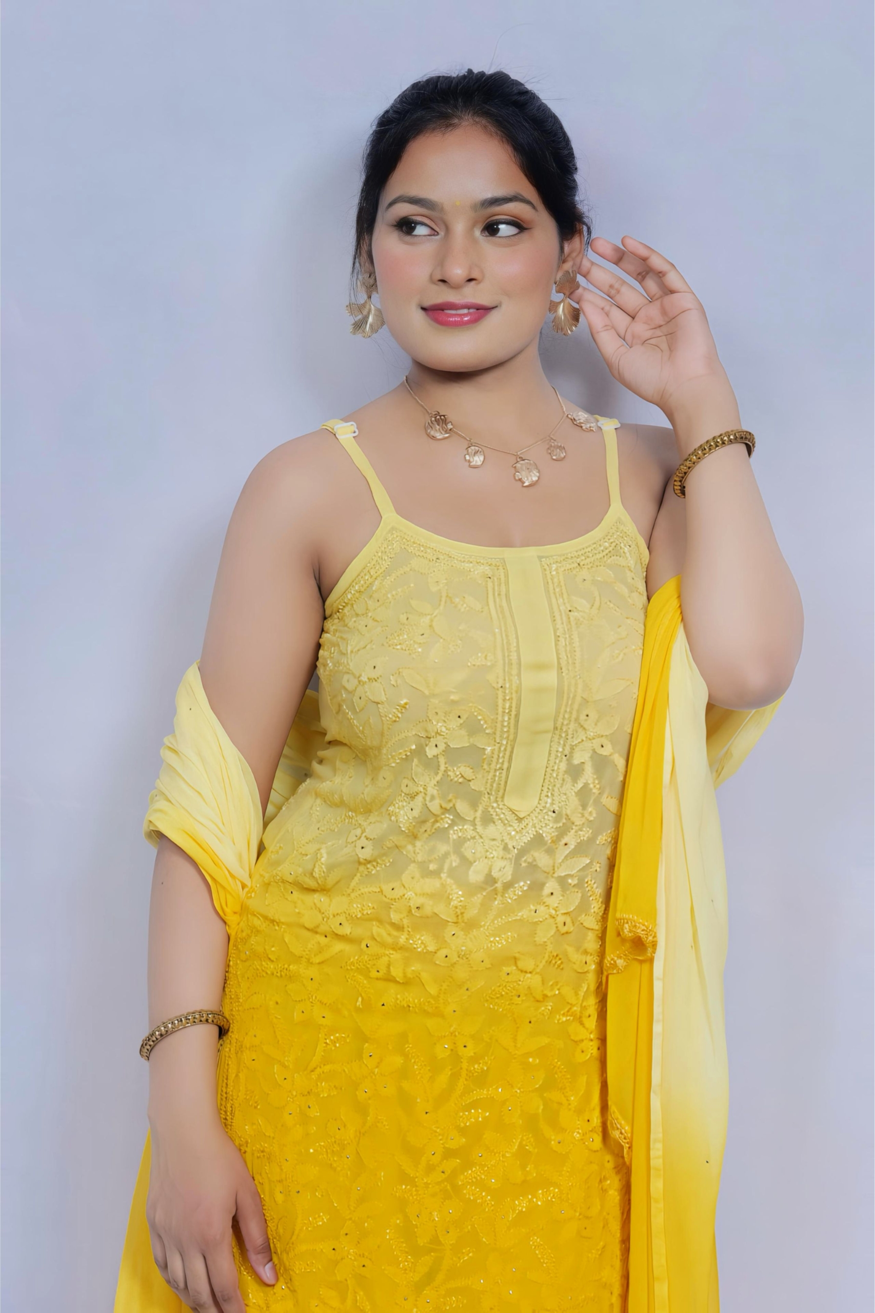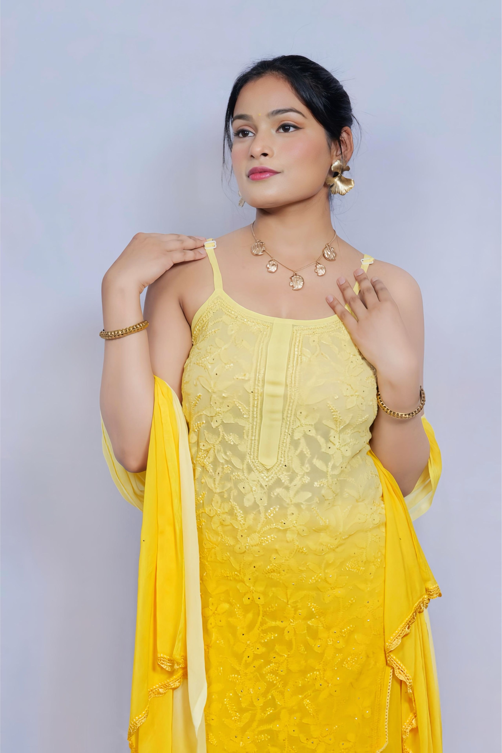 Bring sunshine to your wardrobe with this vibrant yellow Chikankari palazzo suit by Lucknavi Adaa. A perfect blend of grace and glow, this handcrafted piece features delicate embroidery with an ombré finish that flows effortlessly from light to bright. Whether it’s a festive day or a casual glam evening, this suit is all about comfort with charm.